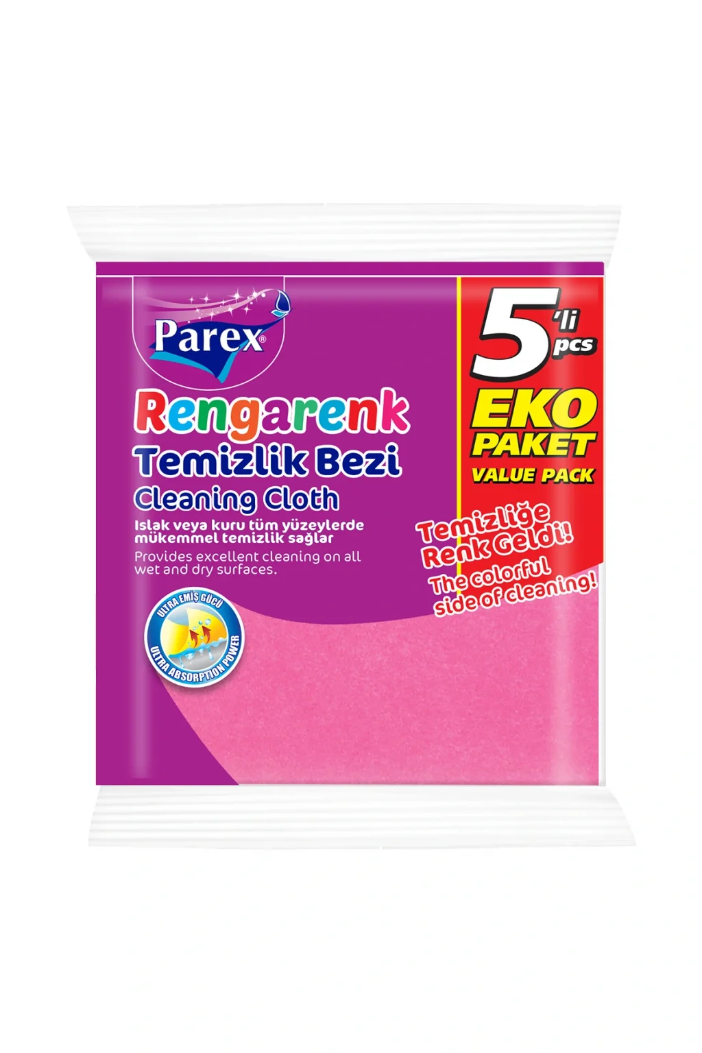 Parex Rengarenk Temizlik Bezi 5'Li Parex Rengârenk Temizlik Bezi, hem ev hem de ofis ortamındaki tüm ıslak veya kuru yüzeylerin temizliğinde rahatlıkla kullanılabiliyor. ; Birden fazla ton seçeneği ile üretilen bezler sayesinde temizlik yapılan yerler için farklı renkler kullanılabiliyor. ; Bu da yapılan temizliğin daha hijyenik olmasına yardımcı oluyor. ; Süper emici dokuya sahip olan Parex Rengârenk Temizlik Bezi, bu güçlü yapısı sayesinde yapılan temizliğin kusursuz olmasını sağlıyor. ; Temizlik sonrasında kolayca yıkanıp kirlerden arındırılabilen Parex Rengârenk Temizlik Bezi, içerdiği doğal gümüş iyonları sayesinde kötü koku oluşumunu da azaltıyor. ; Net Miktar (g/ml)5000MenşeiTÜRKİYEGıda İşletmecisi / Üretici / İthalatçı / DağıtıcıPROVEL TÜKETİM ÜRÜNLERİ SAN.VE TİC.A.Ş.Ürün Bilgilerini Kullanma Hakkındaİnternet sitemizde ve online satış kanallarımızda yer alan ürün etiket bilgileri, ürünün tedarikçisi tarafından Migros Ticaret A.Ş. ; ye iletilen en güncel bilgilerdir. ; Ürün etiket bilgileri ile internet sitemiz ve online satış kanallarımızda bulunan bilgiler arasında herhangi bir farklılık bulunması halinde sorumluluk tamamen tedarikçi firmaya aittir.;