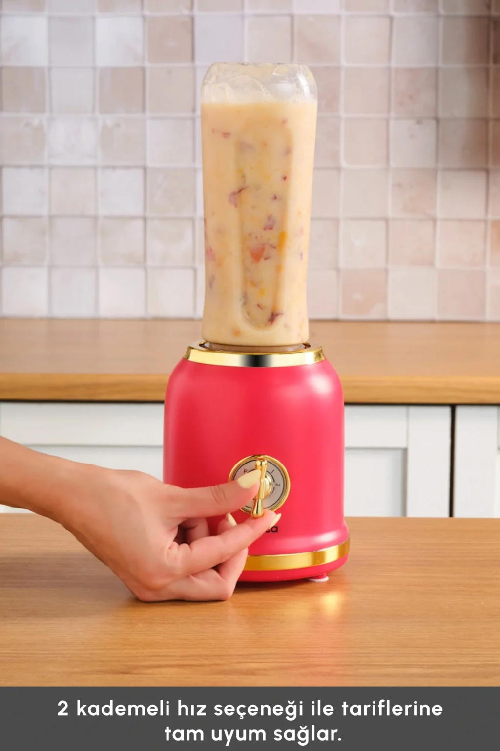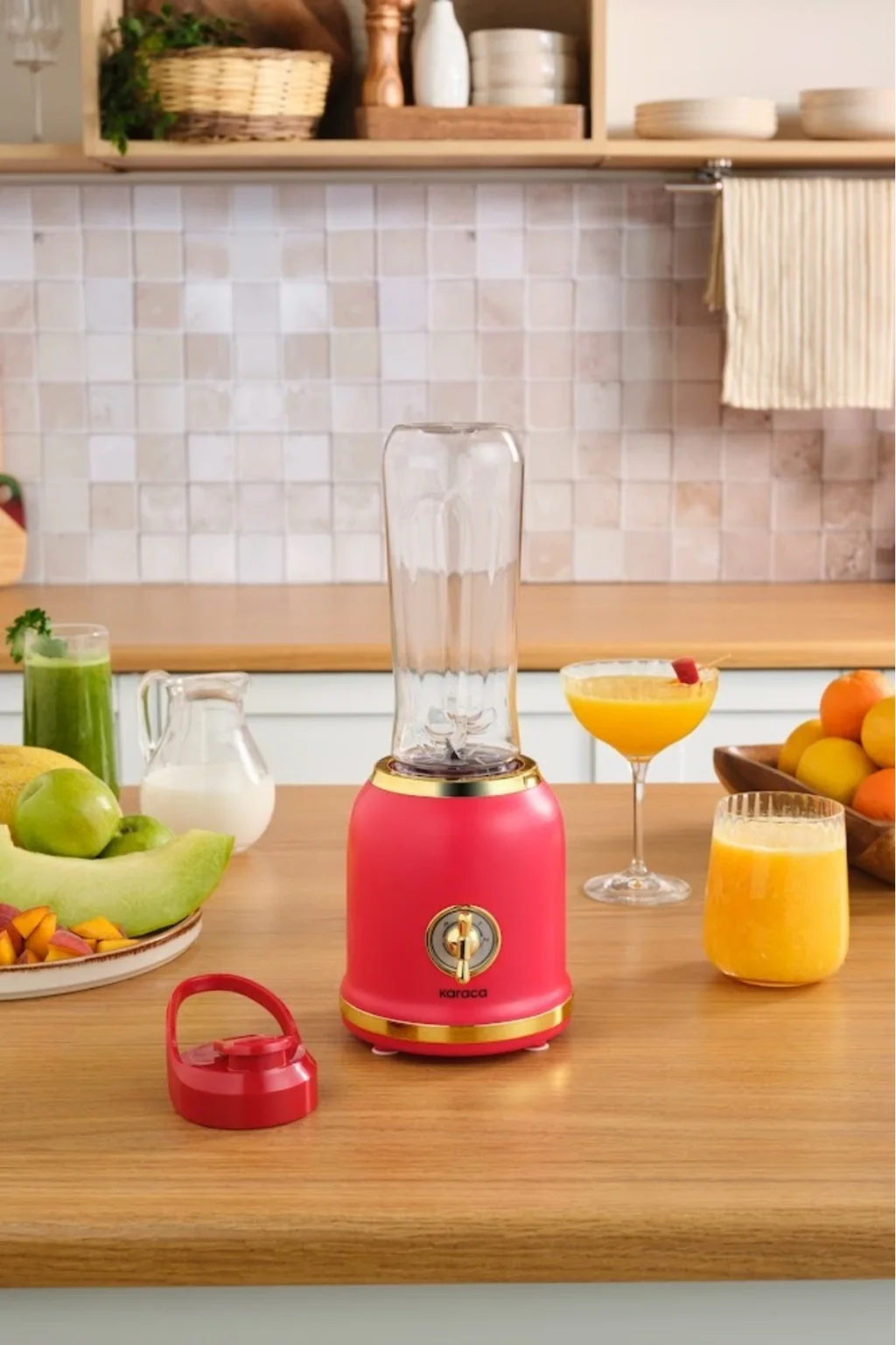 Karaca Retro Personal Kişisel Smoothie Blender Red Özellikler Sızdırmaz haznesi ve saklama kapağı ile gittiğiniz her yere çantanızda rahatlıkla götürebilir, istediğiniz zaman smoothie’nizi içebilirsiniz.; Saklama kapağında bulunan taşıma halkası ile her yere kolayca taşınır.; 600 ml geniş haznesi BPA içermez.; Bu sayede size sağlıklı kullanım olanağı sunar.; Paslanmaz çelik 4 bıçağı ile sebze ve meyveleri hızlıca parçalayıp karıştırabilirsiniz.; Buz kırma özelliği sayesinde tüm buzlu içecekleriniz kolayca hazırlanır 4 farklı renk seçeneği ve retro tasarımı ile mutfağınıza uyum sağlar.; 2 kademeli ayarlanabilir hız seçeneğine sahiptir.; Kaydırmaz ayakları ile tezgaha sabitlenir.; Kullanımı son derece kolaydır.; Güç: 300 W