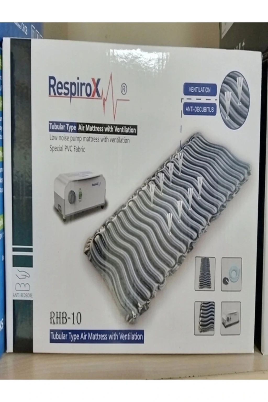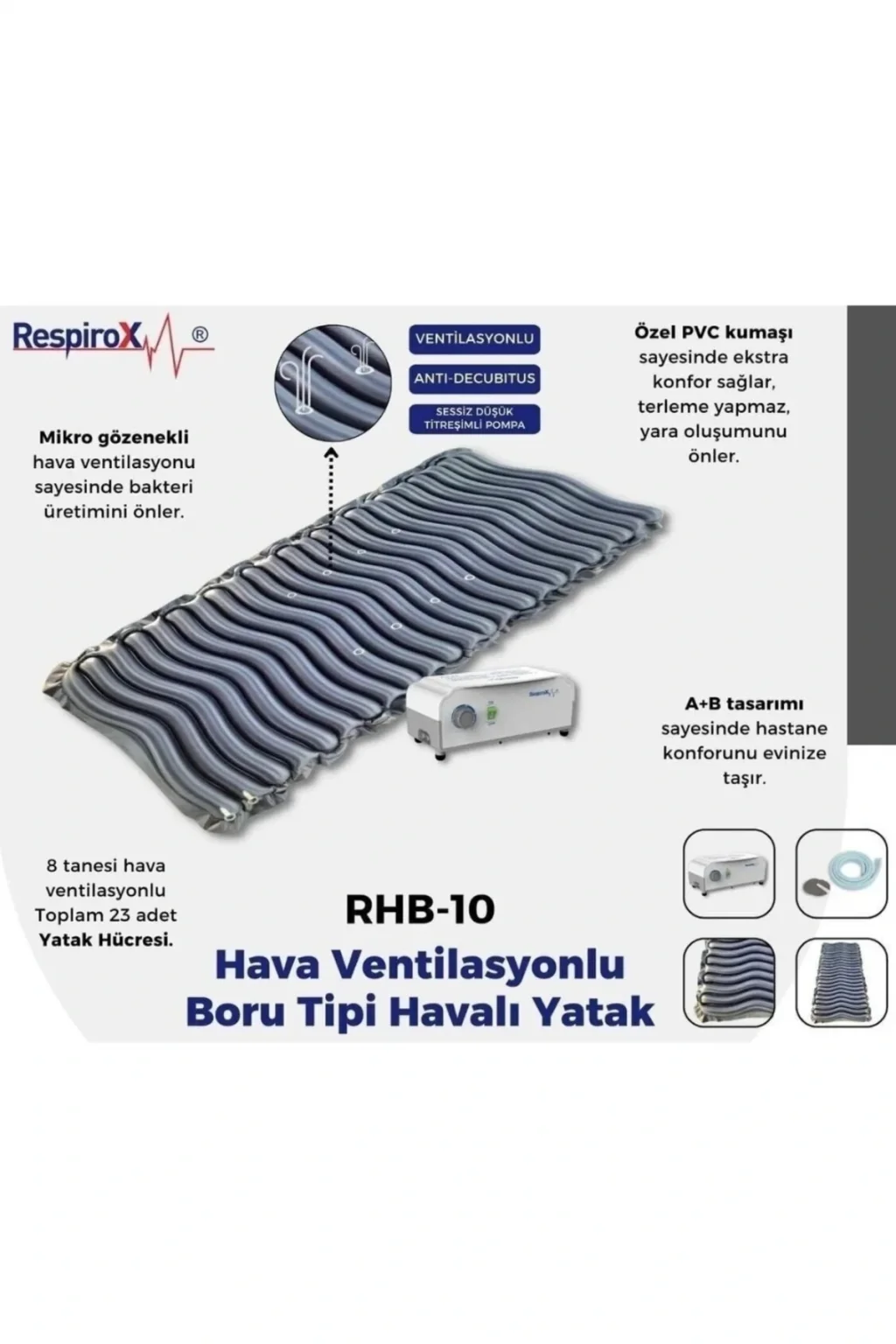 Mikro gözenekli hava ventilasyonu sayesinde, mikro kötü huylu canlı üretimini önler. ; 8 tanesi hava ventilasyonlu Toplam 23 adet Yatak Hücresi. ; Özel PVC kumaşı sayesinde ekstra konfor sağlar, terleme yapmaz. ; A+B tasarımı sayesinde hastane konforunu evinize taşır. ; Yatak Özellikleri Ağırlık Kapasitesi : 130-140 kg Yatak Ağırlığı : 1,8-2,1 kg Boyutlar : 240 cm (L) x 97 cm (W) Malzeme : Naylon PVC/PU hücre, naylon PVC/PU kılıf Kompresör (Pompa) Özellikleri Döngü Süresi : 12 dk Hava Çıkışı : 5 ~ 7 L/dk Basınç Aralığı : 50 ~ 120 mmHg Güç Kaynağı : 110 V / 220 V, 50-60 Hz Güç Tüketimi : 7 W Türü Tek Kişilik Yükseklik 1,5 cm Malzeme PVC Ambalaj Şekli Kutulu;