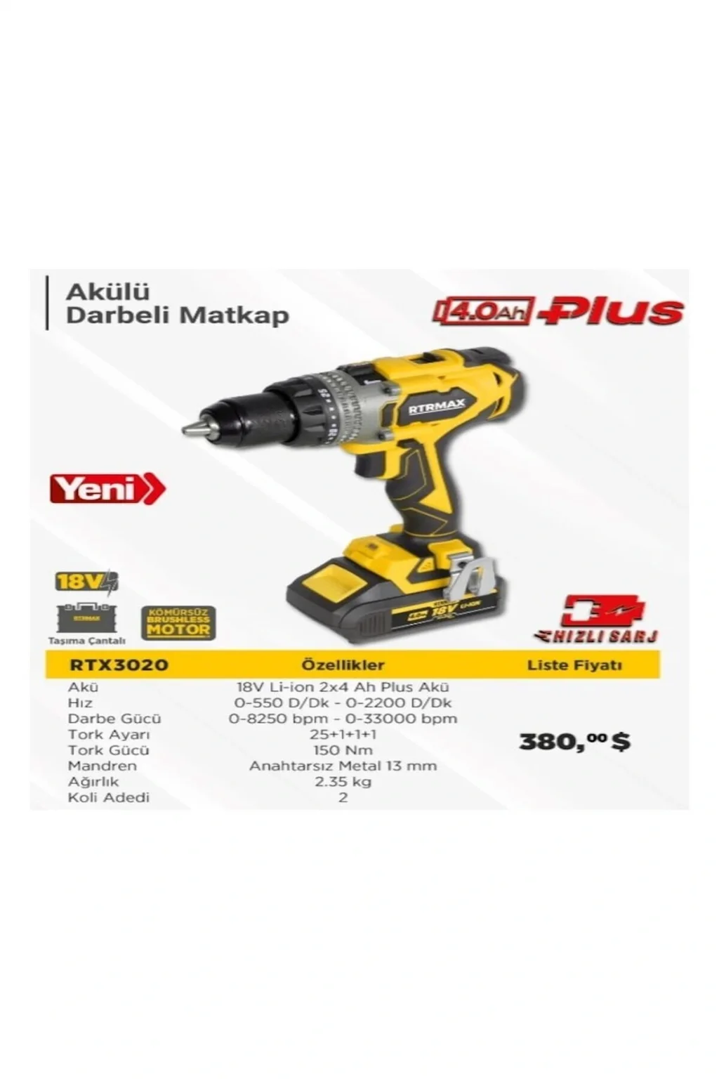 Genel Ürün RTX3020 Akülü 150 NM 2 x 4 AH Plus Akü Darbeli Matkap