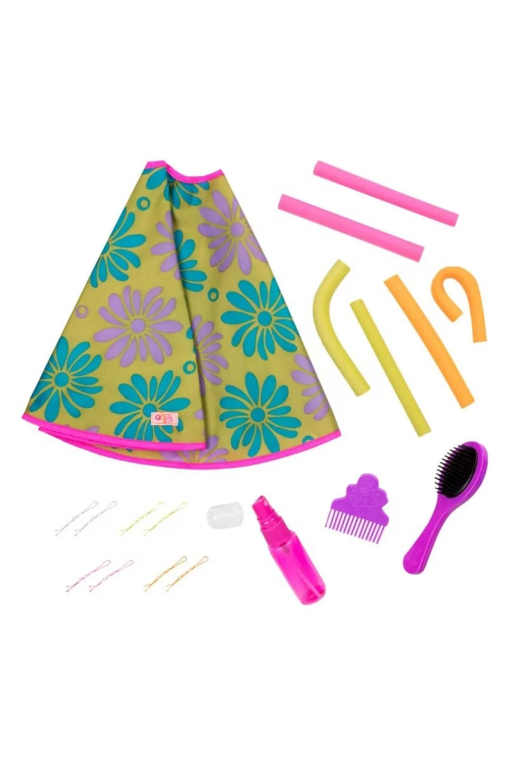 Our Generation Saç Bakım Seti Yaş Grubu: 3 Yaş üzeri için uygundur. Ürün Özellikleri: Ürün Kutu Ölçüleri: 25 x 4 x 32 cm ; Bebeğinizin saçına zarar vermeyecek dalgalı veya kıvırcık saç modeliyle bebeklerinize yepyeni bir görünüm kazandırın.; İlk olarak, kıyafetini temiz ve kuru tutmak için bebeğinizin üzerine örtüyü serin.; Daha sonra, bebeğinizin saçının bir bölümünü suyla hafifçe nemlendirmek için ince sprey şişesini kullanın. ; Saç kısmını yavaşça fırçalayın, kıvırıcının etrafına sarın ve bir tel tokayla sabitleyin. Açık havada kurumaya bırakın.; Lütfen bebeğinizin saçlarını asla ısıya maruz bırakmamayı unutmayın!; Our Generation 46 cm bebekler için aksesuar seti. ; Resimde görülen aksesuarlar dahildir.; Bebek ve kuaför koltuğu dahil değildir.; Paket İçeriği: 1 adet saç fırçası; 1 adet sprey şişesi; 1 adet tarak; 8 adet tel toka; 6 adet bükümlü bukle maşası; 1 adet çiçekli salon pelerini;