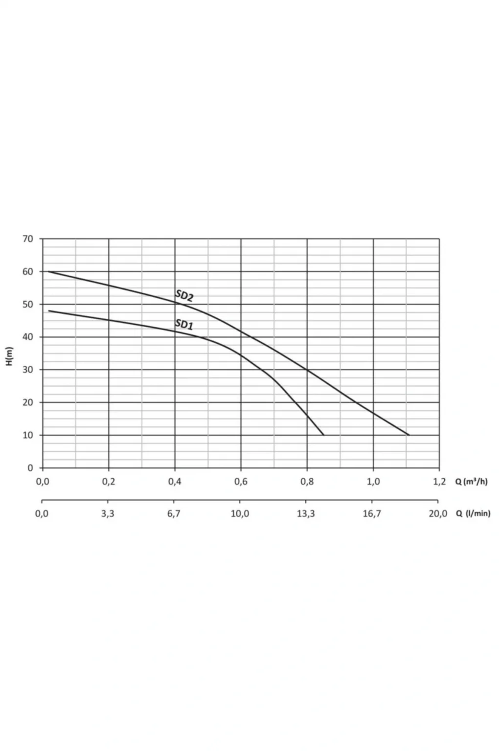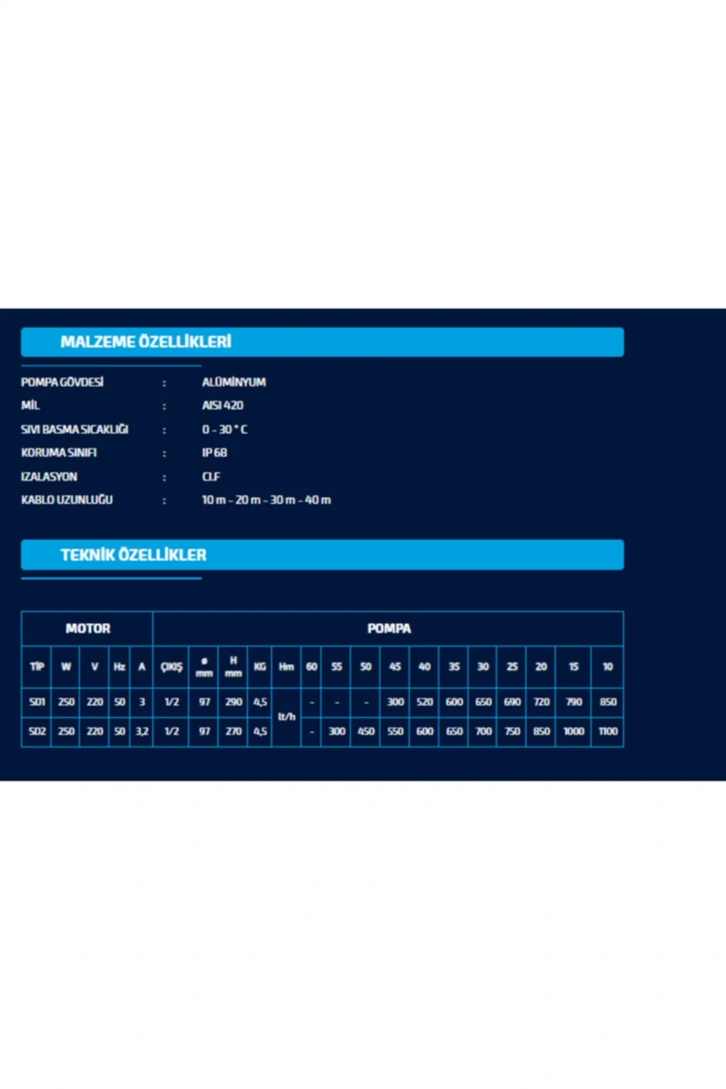 SD2 Elektromanyetik 20 Metre Kablolu Dalgıç Pompa Nedir? Elektromanyetik titreşimli, pratik ve ekonomik kullanım sağlayan dalgıç pompalardır. ; Ev elektriği(220 V) ile çalışmaktadırlar. ; Dikeyde 55m yatayda ise 550m ye kadar su verebilmektedirler. ; SD2 Elektromanyetik 20 Metre Kablolu Dalgıç Pompa Kullanım Alanları Nelerdir? Kuyu , Sondaj ve akarsu, Temiz su ihtiyaçlarında, Bağ bahçe sulamalarında, Yağmur sularının tahliyesinde kullanılmaktadırlar. ; SD2 Elektromanyetik 20 Metre Kablolu Dalgıç Pompa Özellikleri Çıkış : 1/2"(15mm) 220V(ev elektriği ile çalışır) Maksimum sıvı basma sıcaklığı : 30°C' dir 20 metre kablolu 20 metrede 850 lt/h Çıkış:1/2"(15mm) SD2 BASMA MİKTARI DİKEY BASMA YÜKSEKLİĞİ YATAY BASMA UZUNLUĞU - 60 m 600 m 300 lt 55 m 550 m 450 lt 50 m 500 m 550 lt 45 m 450 m 600 lt 40 m 400 m 650 lt 35 m 350 m 700 lt 30 m 300 m 750 lt 25 m 250 m 850 lt 20 m 200 m MOTOR POMPA TİP W V Hz A ÇIKIŞ Qmm Hmm KG Hm 60 55 50 45 40 35 30 25 20 SD2 250 220 50 3.2 1/2 97 270 4 lt/h - 300 450 550 600 650 700 750 850 HP : 0.33 HP kW : 0.25 kW Voltaj : 220 Volt (Monofaze) Max. ; Yükseklik mSS : 51-75 mss Çıkış Ölçüsü : 1/2" - 15 mm;