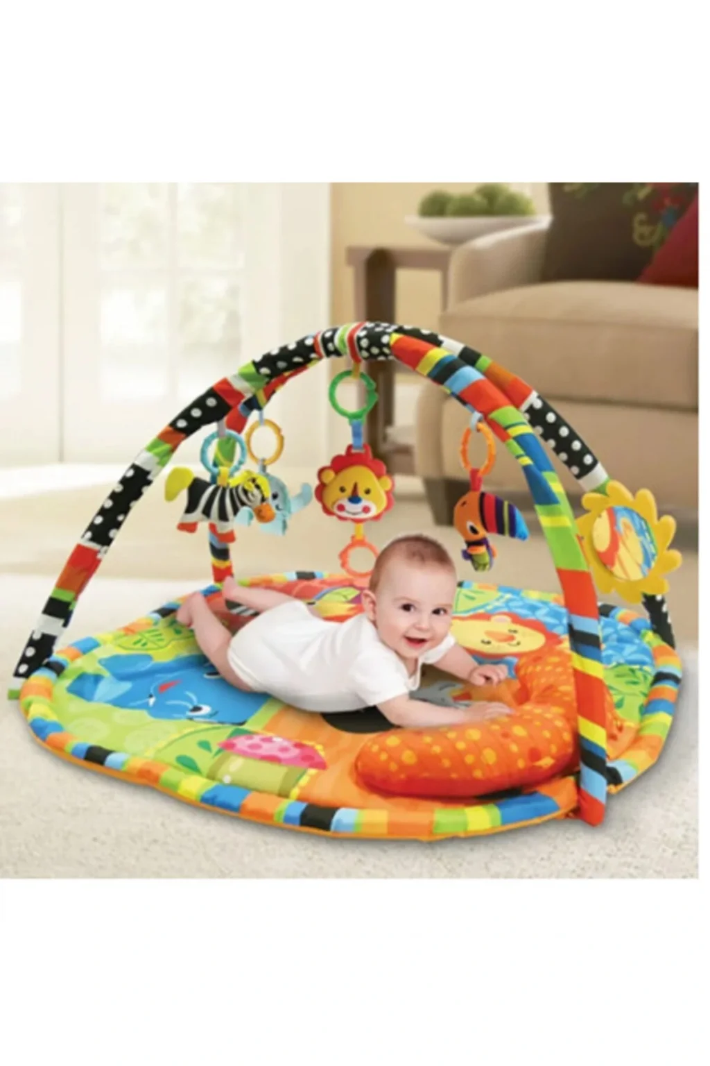 Renkli ve serüven dolu oyun halısı; müzik ve sesler ile bebeğinizin isteklerine cevap verirken, gelişimine de destek verir. ; Bebeğiniz halı üstünde yatıp oynayabilir; karın üstü yatarak eğlenebilir ve hışırdayan ayaklar ile kuyruğa sahip zebra, peluş papağan, melodiler çalan aslan, sevimli kelebek diş kaşıyıcı, büyük döner çıngıraklı topa sahip fil oyuncakları sayesinde keyifli zaman geçirebilir. ; Halkalara bebeğinizin favori oyuncaklarını asabilir; onun karın üstü kalkıp oyuncakları keşfetmesine olanak sağlayabilirsiniz. ; Yumuşak yastık ise bebeğinizin rahatça uzanmasını sağlar. ; Melodili aslan 2 adet LR44 pil ile çalışır. ; Özgürlük!: Bebekler yuvarlanabilir, kendilerini kaldırabilir ve keşif yapabilirler. ; Böylece motor hareket becerileri gelişir ve fiziksel olarak güçlendirebilirler. ; Keşfet!: Orman dostları, canlı renkler ve yüksek kontrastlı desenler ile görsel becerilerin gelişimi ; Kırılmaz ayna & oyuncaklar: Bebeğin kendini keşfetme becerisini destekleyen ayna ve bebeği eğlendiren oyuncaklar ; Çıkarılabilir oyuncaklar: Oyuncaklar halıya takılabilir veya ayrı olarak da bebekler onlarla oynayabilir. ; Pratik kullanım: Her yerde oynayabilmek için kolay katlama ; ÖLÇÜ: 80*80*49;