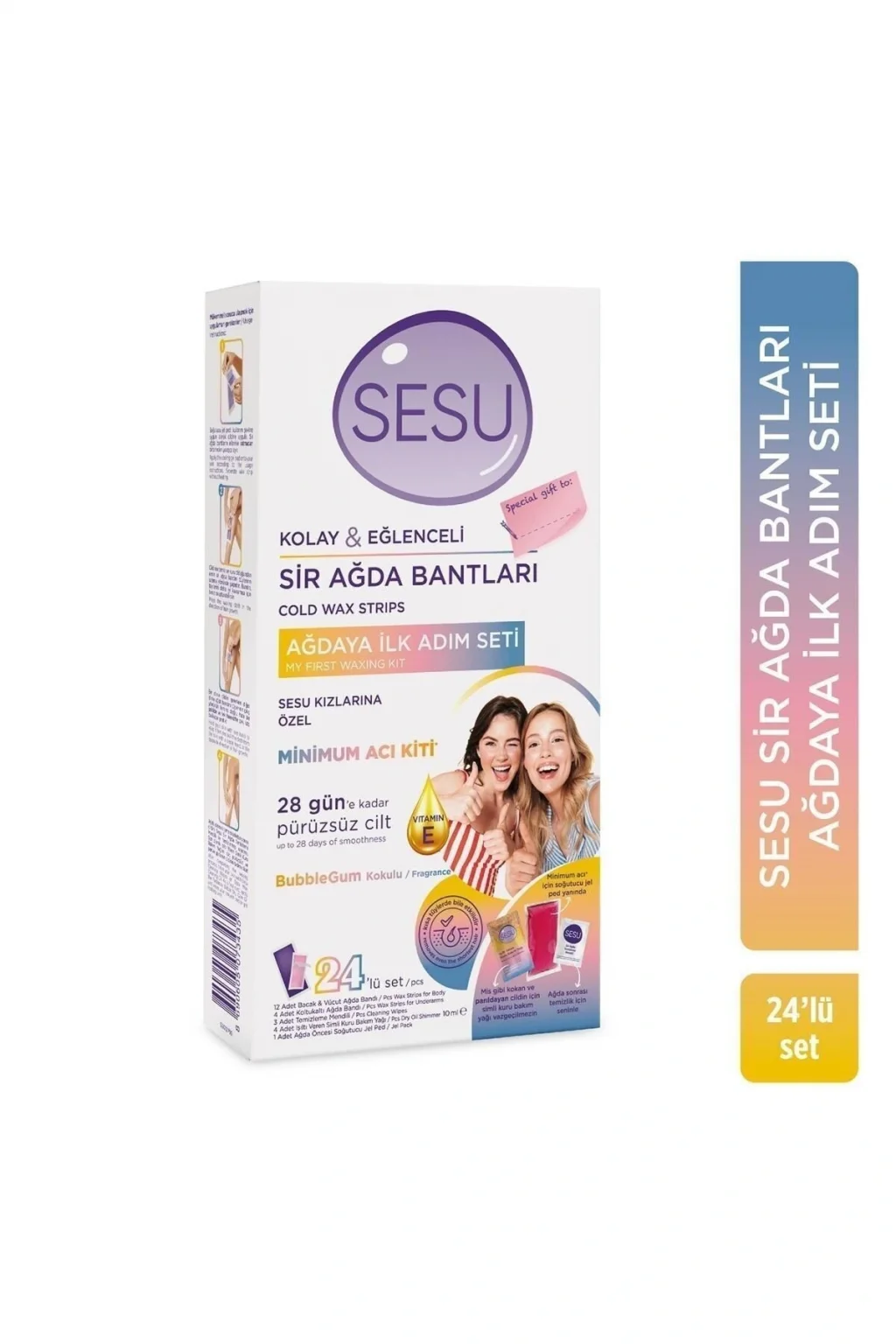 SESU İLK ADIM SİR AĞDA BANTLARI • Ağdaya yeni başlayan genç kızlar için özel olarak geliştirilen Sesu Ağdaya İlk Adım Seti içerisinde;o 4 adet BubbleGum kokulu simli kuru bakım yağıo 3 adet ağda sonrası temizlik için sir ağda temizleme mendilio 1 adet minimum acı hissetmen için soğutucu jel pedo 12 adet Bacak & Vücut Ağda Bandıo 4 Adet Koltukaltı Ağda Bandı bulunuyor.; • BubbleGum kokusuyla cildinin güzel kokmasını sağlar.; • Işıltı veren Kuru Bakım Yağı ile cildine bakım yaparak ışıl ışıl görünmesini sağlar.; • Kolay açılabilir formüle sahiptir.; Bantlar ellerinle ısıtmana gerek kalmadan kolayca birbirinden ayrılır.; • 28 güne kadar pürüzsüz bir cilt vadeder.; Sadece tek harekette maksimumum pürüzsüzlüğe ulaştırır.; • Dermatolojik olarak test edilmiştir.; • Kısa tüylerde bile etkilidir.; • Cildi arındırma etkisine sahiptir.; • İçeriğindeki E Vitamini sayesinde cildi nemini korumaya yardımcı olur.; • Kolay, hızlı ve etkili ağda deneyimi sunar.; • Bacak ve Vücut bölgesi için kullanıma uygundur.