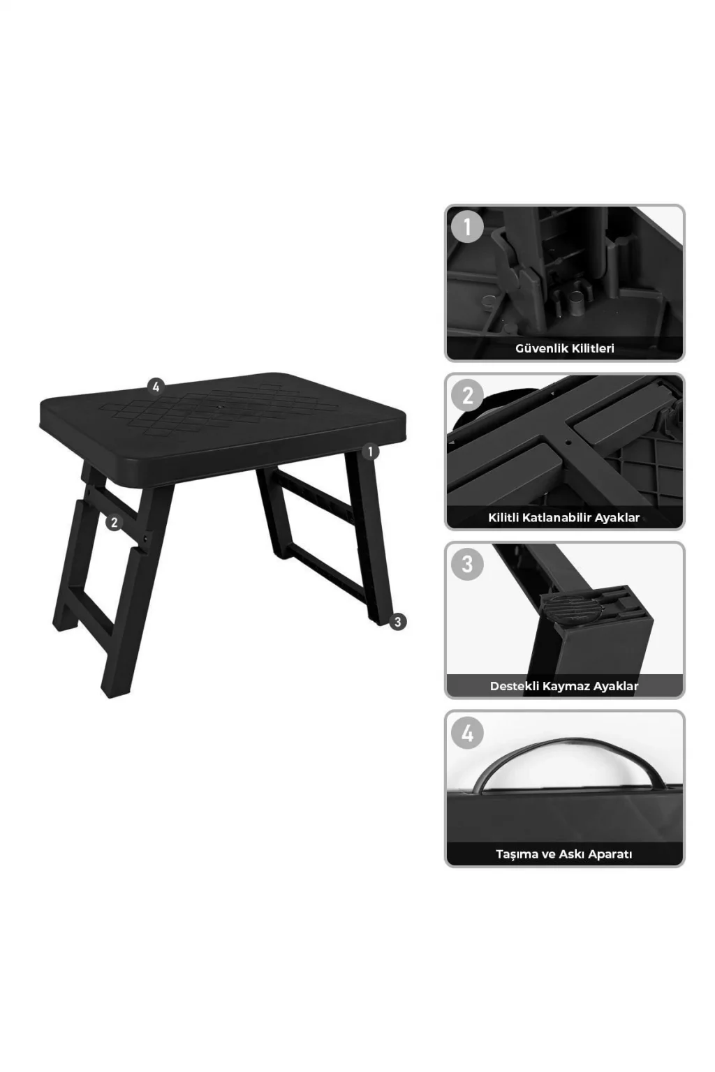 Hafif ve dayanıklı plastik malzeme kullanılarak üretilmiş, kolay taşınabilir ve uzun ömürlü kullanım sunar; Katlanabilir tasarımı sayesinde, kullanılmadığı zamanlarda yer kaplamaz ve kolayca saklanabilir; böylece kamp, piknik veya balkon gibi alanlarda pratik bir çözüm sağlar; Kolay temizlenebilir yüzeyi ile hijyenik bir kullanım imkanı sunar; leke tutmaz ve bakımı kolaydır; Çok yönlü kullanım alanları için idealdir; kamp masası, sehpası veya balkon masası olarak kullanılabilir; her türlü dış mekan etkinliğinde rahatlıkla tercih edilebilir;