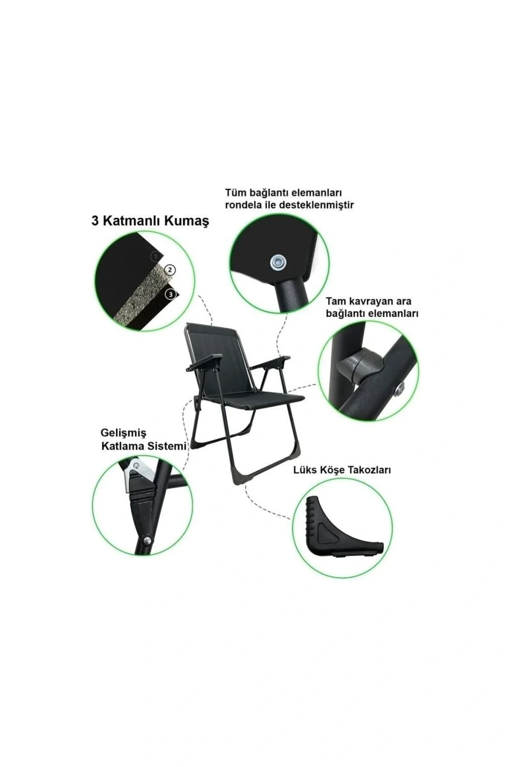 Katlanır Plastik Kollu Lüks Kamp Sandalyesi Katlanır plastik kollu lüks kamp sandalyesi Tasarım tescilli katlanır sandalyemiz uzun yıllar kullanabileceğiniz sağlamlıkta üretilmektedir. ; Plajda, kampta, piknikte, bahçenizde, balkonunuzda, terasınızda kısacası ihtiyacınız olan her yerde kullanabileceğiniz katlanır sandalyemiz tam size göre. ; Katlanır sandalyemizde 0,80mm et kalınlığında dkp boru kullanılmaktadır. ; Mat siyah renkte elektrostatik toz boyalıdır. ; Kumaşı 3 katmandan oluşmaktadır. ; 1. ; Kat 600 denye kumaş 2. ; Kat polietilen şilte 3. ; Kat ise astardan oluşmaktadır. ; Kumaşı tek parçadır ve çift dikişlidir. ; Açma kapama mekanizması benzersizdir. ; Piyasadaki ürünler gibi kasarak çalışmaz ve oturma kısmındaki destek kumaşını kesmez. ; Bağlantı kısımlarında her bir perçin rondela ile desteklenmektedir. ; Plastik kolları, ayak takozları ve diğer plastik ekipmanlarının ham maddesi kopolimer moblen'dir, çok sağlamdır. ; Katlanır sandalyemizin taşıma kapasitesi 90 kg 'dır. ; Ürün ölçüleri: Oturma yüksekliği: 38cm Sırt yüksekliği (yerden): 80cm Oturma alanı derinliği: 42cm Oturma alanı genişliği: 44cm Dıştan dışa genişliği: 56cm Kolçak genişliği: 5,5cm Kolçak derinliği: 35cm Kapalı halde ölçüleri: 56cm x 74cm x 8,5cm;