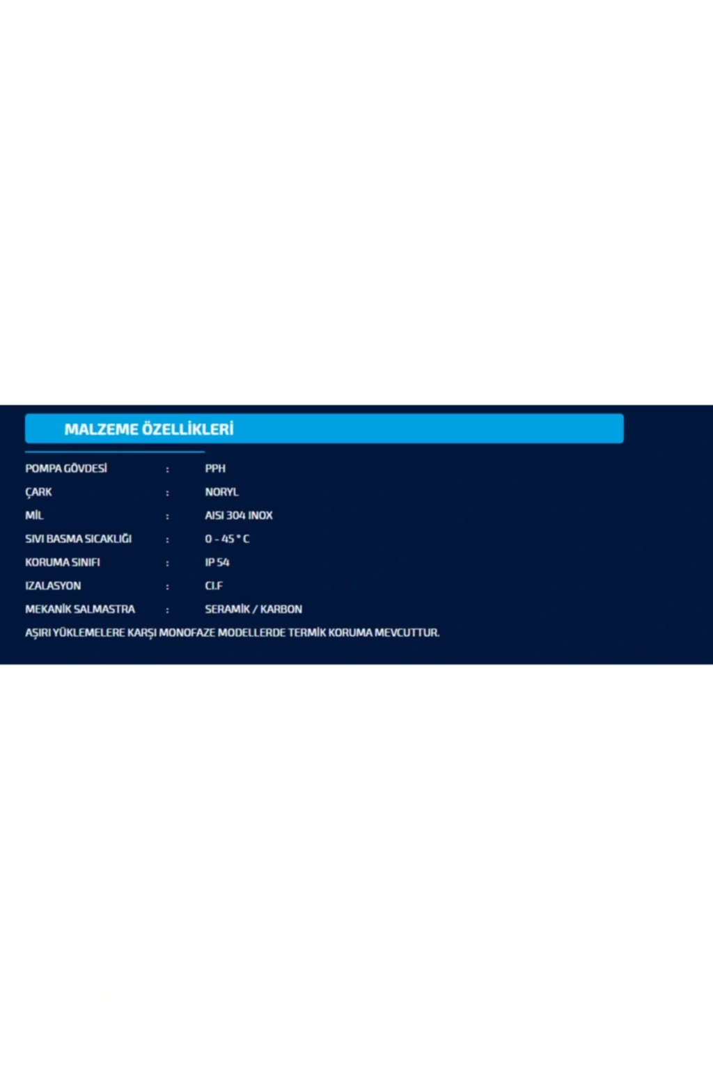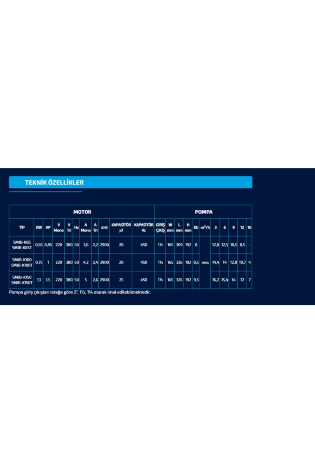 Hidromasajlı jakuzilerde kullanılmak üzere üretilmiş teknopolimer gövdeli ve noril çarklı pompalardır; Hidroterapi ve masaj amacıyla üretilmiş jakuzi havuzlarında suyu havuzun altından emip emip, havayla birleştirerek nozüllerden havuz içine basan pompalardır; Deterjan, sabun, şampuan gibi kimyasallara dayanıklıdır; Sessiz ve sarsıntısız çalışmaktadır; Jakuzi pomparı asidik ve bazik suya karşı dayanıklı olduğundan endüstriyel tip bulaşık makinalarında da kullanılabilir; Sumak SMJB; K85 Debi Miktarları Dikey Basma Yüksekliği Yatay Basma Yüksekliği Su Saate 12; 8 METRE 128 METRE 3 TON 12; 5 METRE 125 METRE 6 TON 10; 5 METRE 105 METRE 9 TON 8; 5 METRE 85 METRE 12 TON Marka : Sumak Tip : Jakuzi Pompası Gövde Malzemesi : Poliproblen plastik Çark Malzemesi : Noril Mil : Paslanmaz Çelik Motor Gücü : 0; 85 HP Enerji : 220 V Termik Koruma : Mevcut Maksimum Basınç : 12; 8 mss Maksimum Debi : 16 m3/h Emme / Basma Ölçüsü : 1 1/2'' – 1 1/2'' Maksimum İşletme Basıncı : 6 Bar Maksimum Akışkan Sıcaklığı : 40°C Maksimum Ortam Sıcaklığı : 40°C Motor Gövdesi : Alüminyum İzolasyon Sınıfı : F Motor Koruma Sınıfı : IP X5 Sızdırmazlık : Mekanik Keçe) Alüminyum/Karbon grafit;