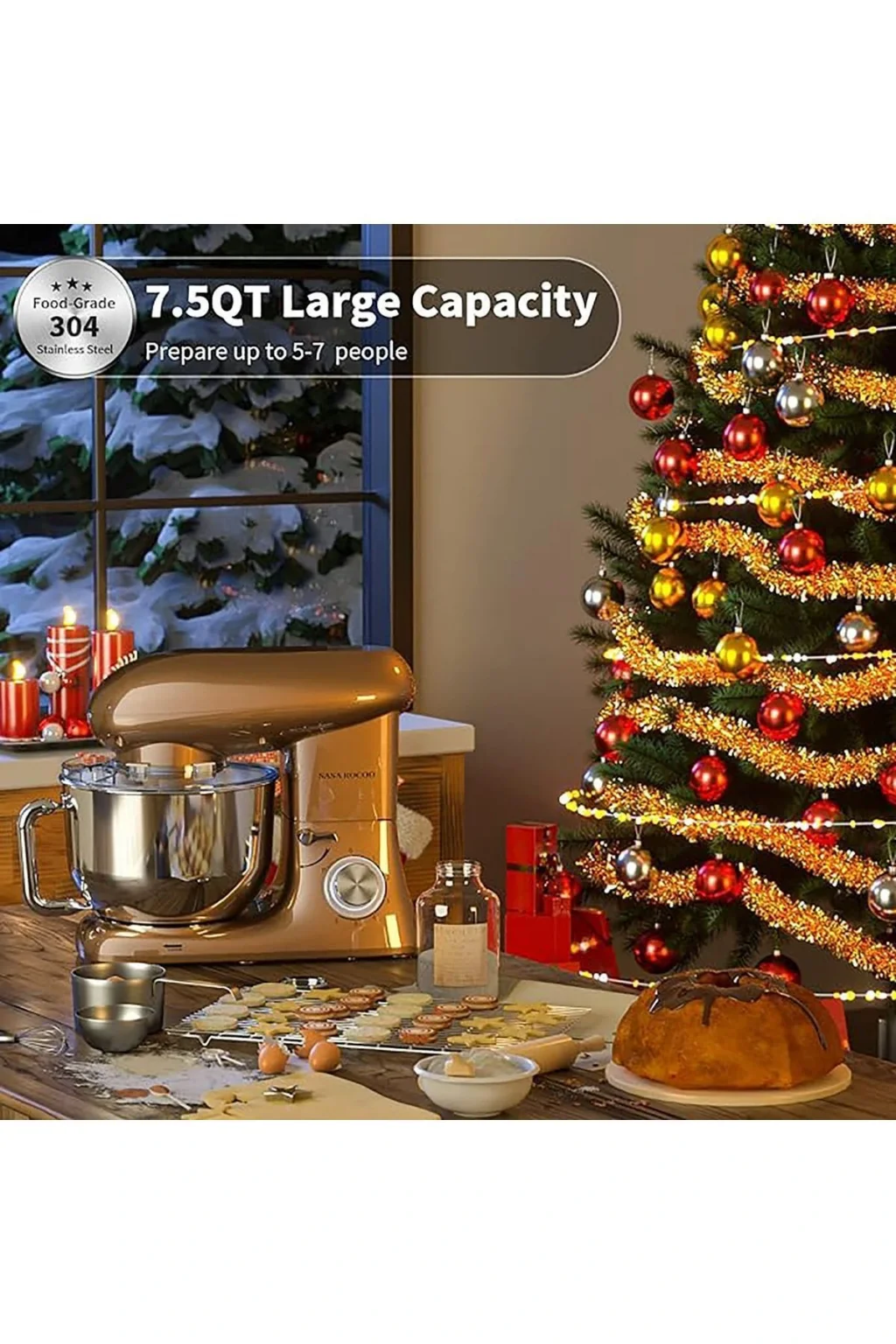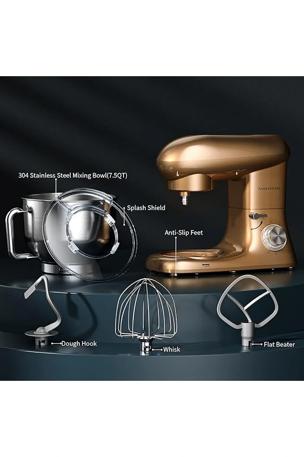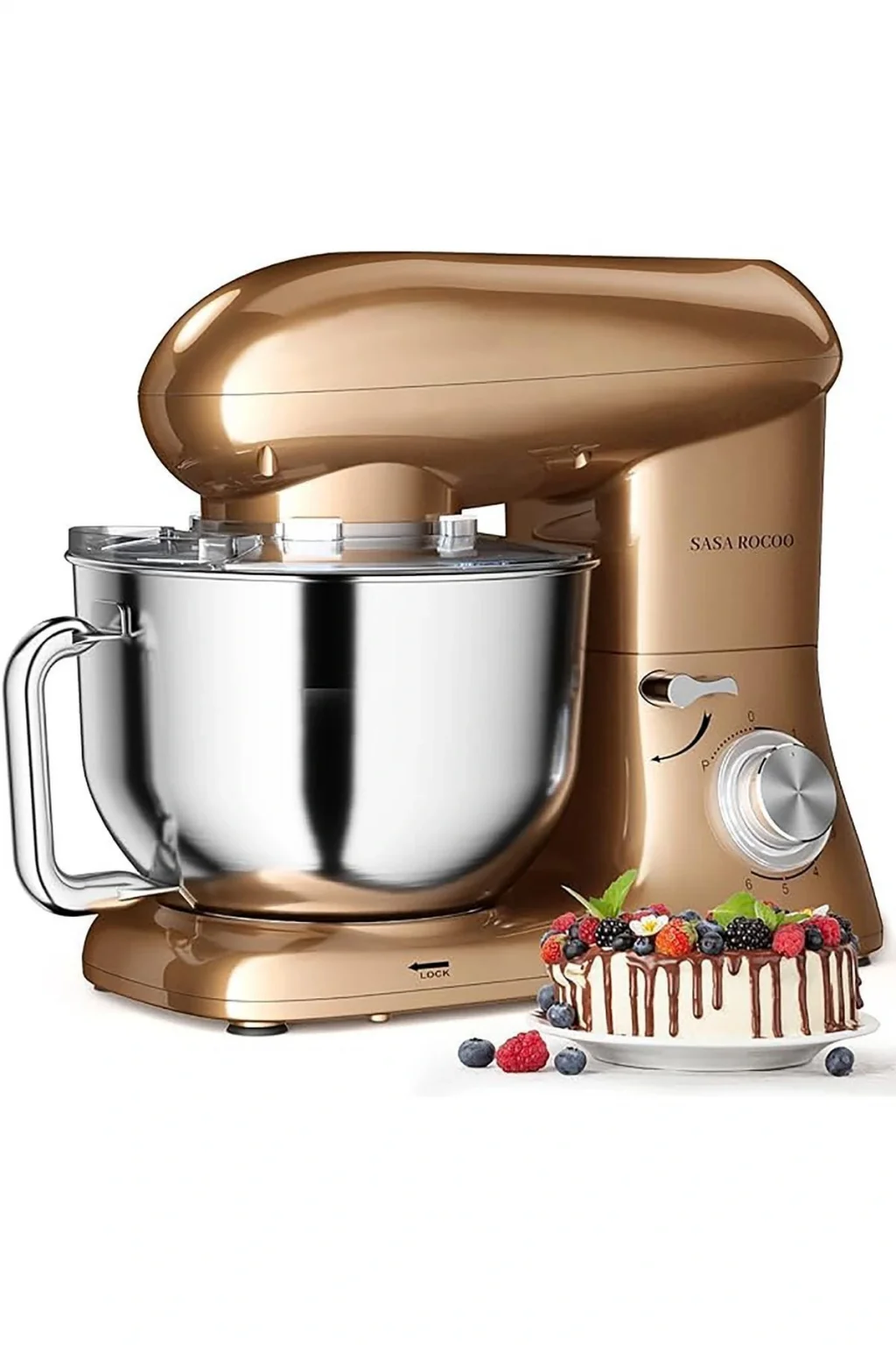 - 1500 watt gücünde yüksek performans sunan Sasa Rocoo Stand Mikser, mutfak işlerinizi kolayca halledin.; - 7.5 QT (7.1 LT) hacmiyle geniş kapasitesiyle büyük miktarlardaki malzemeleri rahatlıkla karıştırın.; - Tilt-head tasarımı sayesinde kolay kullanım ve mükemmel karıştırma deneyimi sağlar.; - 6 kademeli hız ayarı ile farklı tarifler için ideal karıştırma hızını seçebilirsiniz.; - 2 yıl ithalatçı garantisi ile güvenilir bir kullanım sunar.; - Hamur kancası özelliği ile hamur yoğurma işlemlerinizi pratik bir şekilde yapabilirsiniz.; - 220 - 240 V voltaj aralığı ve 50 Hz / 60 Hz frekansı ile geniş bir kullanım alanı sağlar.; - C / F priz tipi sayesinde dünya genelinde yaygın olarak kullanılan prizlerle uyumludur.; - Şık gold rengiyle mutfağınıza modern bir dokunuş ekler.