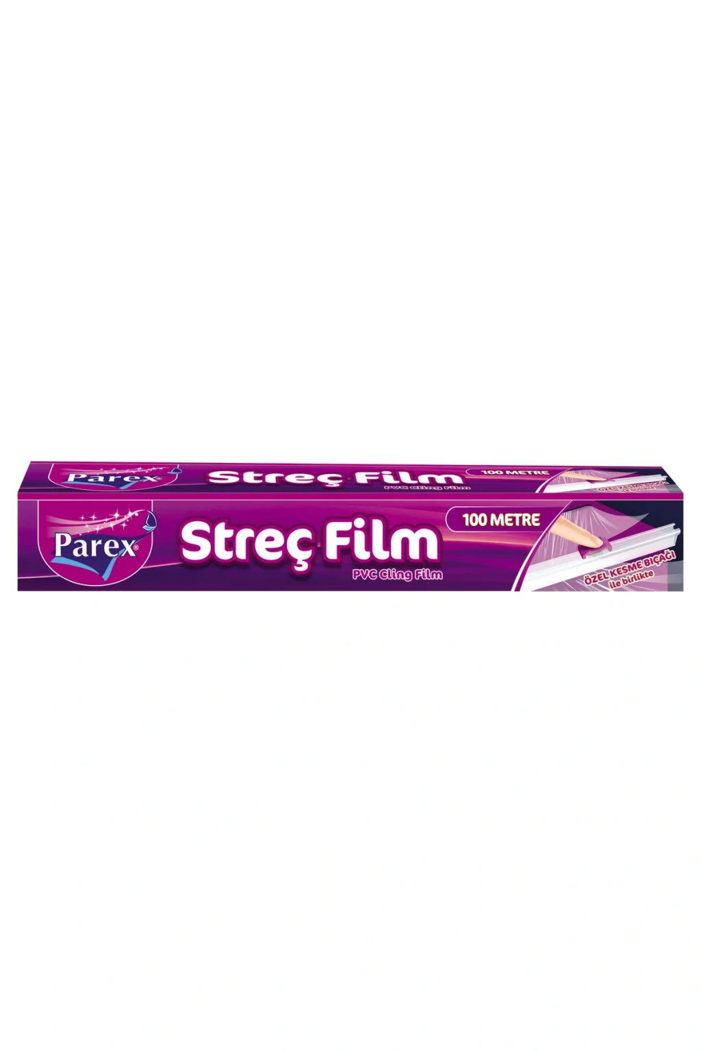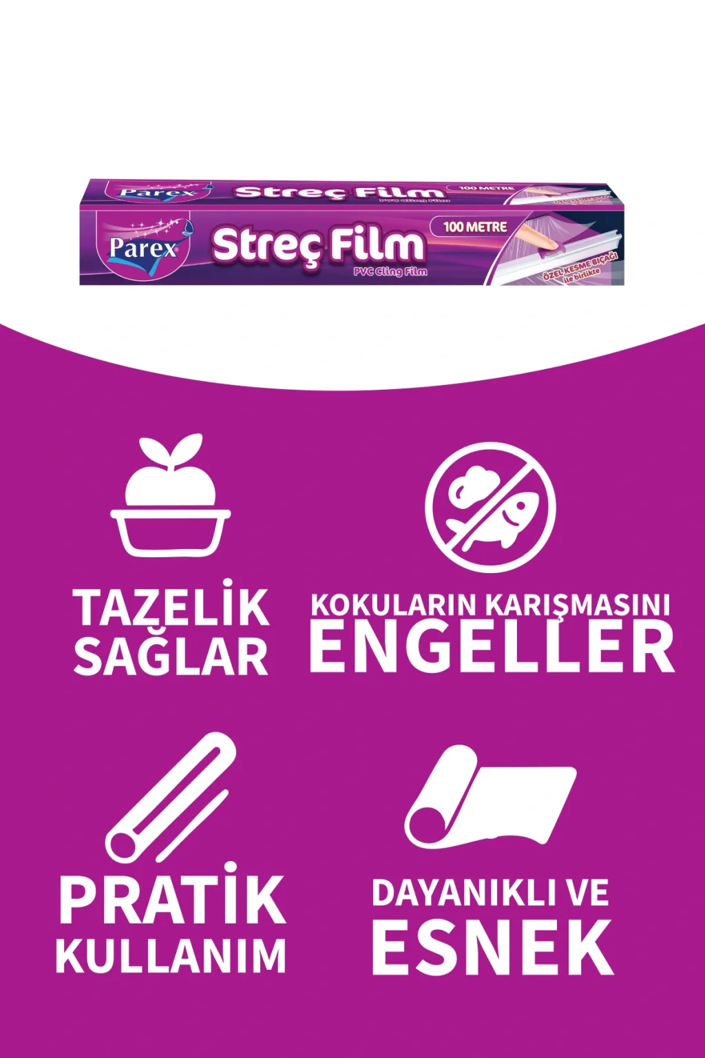Parex Streç Film 30 cm x 100 m 7 Mikron - Şeffaf - Kesme Bıçağı Hediyeli Streç Filmler elastik yapısı sayesinde yiyeceklerin havayla etkileşimini ortadan kaldırarak daha uzun süre taze kalmalarını ve hijyenik bir ortamda saklanmalarını sağlar.; Yiyeceklerinizi paketlemede, saklamada ve taşımada gönül rahatlığıyla kullanabileceğiniz streç filmlerimiz, esnekliği artırıcı ve sağlığa zararlı maddeler içermez.; Streç film, yüzeyinde biriken statik elektrik sayesinde çok sayıda pürüzsüz yüzeye kolaylıkla tutunur.; Parex Streç Filmini , sandviç, peynir gibi gıda ürünlerini sarıp saklanması için kullanılabileceği gibi aynı zamanda buzdolabında saklanan yemeklerin üzerinin kapatılıp kokularının karışmaması için kullanabilirsiniz.; Streç film ile sarılan gıdalar, buzdolabında tazeliklerini de belli bir süre korumaktadir.; Parex Streç Filmleri, gıdaya temas eden ürünler olduğu için, standartlara uygun olarak, el değmeden ve hijyenik olarak üretilmektedir.; Online alışveriş sitesi Ofix.; com sitemizde, tüm mutfak sarf ürünlerine avantajlarıyla ulaşabilirsiniz.; Sitemizde streç film fiyatları piyasa ortalamasına göre uygun düzeydedir.; Kurumsal müşterilerimize sunduğumuz ekstra fiyat avantajlarından yararlanmak için Ofix.; com sayfamızı ziyaret edebilirsiniz.; Aradığınız en uygun streç film modellerini hemen ayağınıza getiren ofix.; com sizlere her zaman en ucuz ve kaliteli streç film modellerini sunmaktadır.; Farklı marka veya model streç film arıyorsanız, sitemizin Gıda ve Mutfak Ürünleri - Kullan At Mutfak Malzemeleri - Mutfak Sarf Malzemeleri kategorisinden beğendiğiniz ürünü seçip hemen sipariş verebilirsiniz.; Tüm ihtiyaçlarınız tek adresi Ofix.; com size her zaman güvenilir bir alışveriş imkanı sunmaktadır.; Parex Streç Film Özellikleri: Parex Streç Film gıdaların nefes almasını sağlayarak uzun süre taze tutar.; Yiyeceklerin kokusunun birbirine karışmasını ve etrafa .; Bakteri oluşumunu engelleyerek gıdalar için hijyenik bir koruma ortamı sağlar.; Kullanımı pratiktir.; Gıdaların yapı ve cinsine göre direkt veya bulundukları kabın üzerine gergin bir şekilde sarılarak kullanılır.; Ölçüsü: 30 cm x 100 m 7 Mikron Parex Provel Sanayi ve Tic.; A.; Ş.; markası olan Parex, 2011 yılında %100 yerli sermaye ile Türkiye’nin en yenilikçi markası olma amacıyla yola çıktı.; 81 çeşit ürünle girdiği sektörde tüm satış noktalarında tüketicileriyle buluşan Parex, sadece iki yıl içinde büyük oyunculardan biri haline geldi.; Bugün 300’e ulaşan ürün çeşidi ile 5 farklı kategoride faaliyet gösteren Parex, kimyasal olmayan temizlik yardımcıları pazarında en çok tercih edilen marka olarak pazar lideri konumundadır.