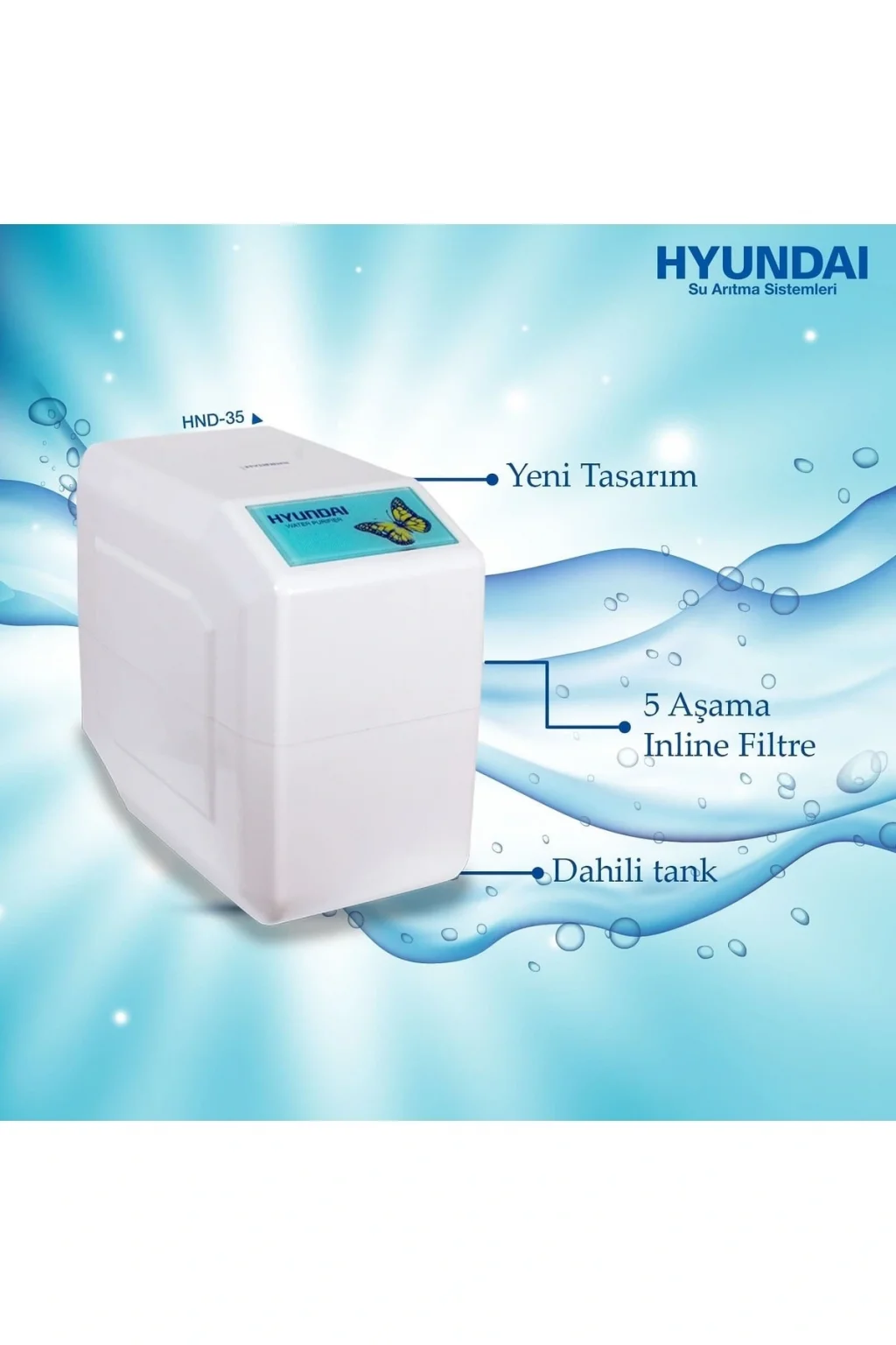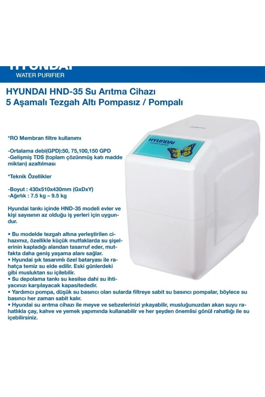 Az yer kaplayan şık tasarımı ile günde 285 Litre arıtma kapasitesine sahip ev ve küçük ofis kullanımına uygun arıtma cihazıdır. ; Ev tipi arıtma sistemi olarak üretilmiştir. ; 1. Filtre: Sediment ön filtre ; 2. Filtre: GAÇ karbon filtre ; 3. Filtre: Blok karbon filtre ; 4. Filtre: 75 GPD hyundai membran filtre ; 5. Filtre: Mineral filtre Arıtma kapasitesi: 75GPD 285 Litre/Gün Az yer kaplayan şık tasarım ; Maksimum tank kapasitesi ; 12 litre Ağırlık 8 kg. En:28 cm, Yükseklik: 28 cm, Uzunluk 49 cm ;