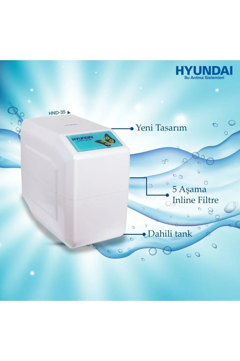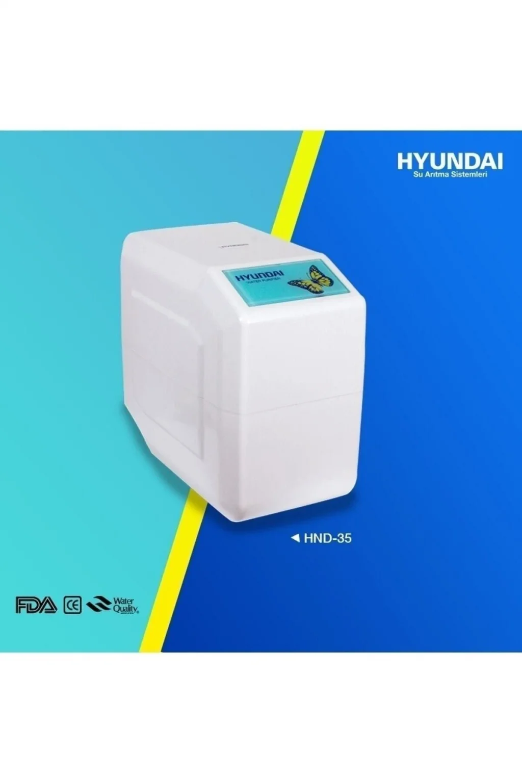 Hyundai Marka Kapalı Kasa Pompasız HND-35 Model Su Arıtma Cihazı Sağlık ve ekonomi dostu.; NSF Belgelidir.; HYUNDAİ SU ARITMA TEKNİK ÖZELLİKLERİ ; Az yer kaplayan şık tasarımı ile günde 285 Litre arıtma kapasitesine sahip ev ve küçük ofis kullanımına uygun arıtma cihazıdır.; Ev tipi arıtma sistemi olarak üretilmiştir.; 1. Filtre: Sediment ön filtre ; 2. Filtre: GAÇ karbon filtre ; 3. Filtre: Blok karbon filtre ; 4. Filtre: 75 GPD membran filtre ; 5. Filtre: Mineral filtre Arıtma kapasitesi: 75GPD 285 Litre/Gün Az yer kaplayan şık tasarım ; Maksimum tank kapasitesi ; 8 litre Ağırlık 8 kg.; En:28 cm, Yükseklik: 28 cm, Uzunluk 49 cm Hyundaı Su Arıtma Cihazı, HND-35 Ürün Pompasızdır.; Kurulum fiyata dahil değildir.