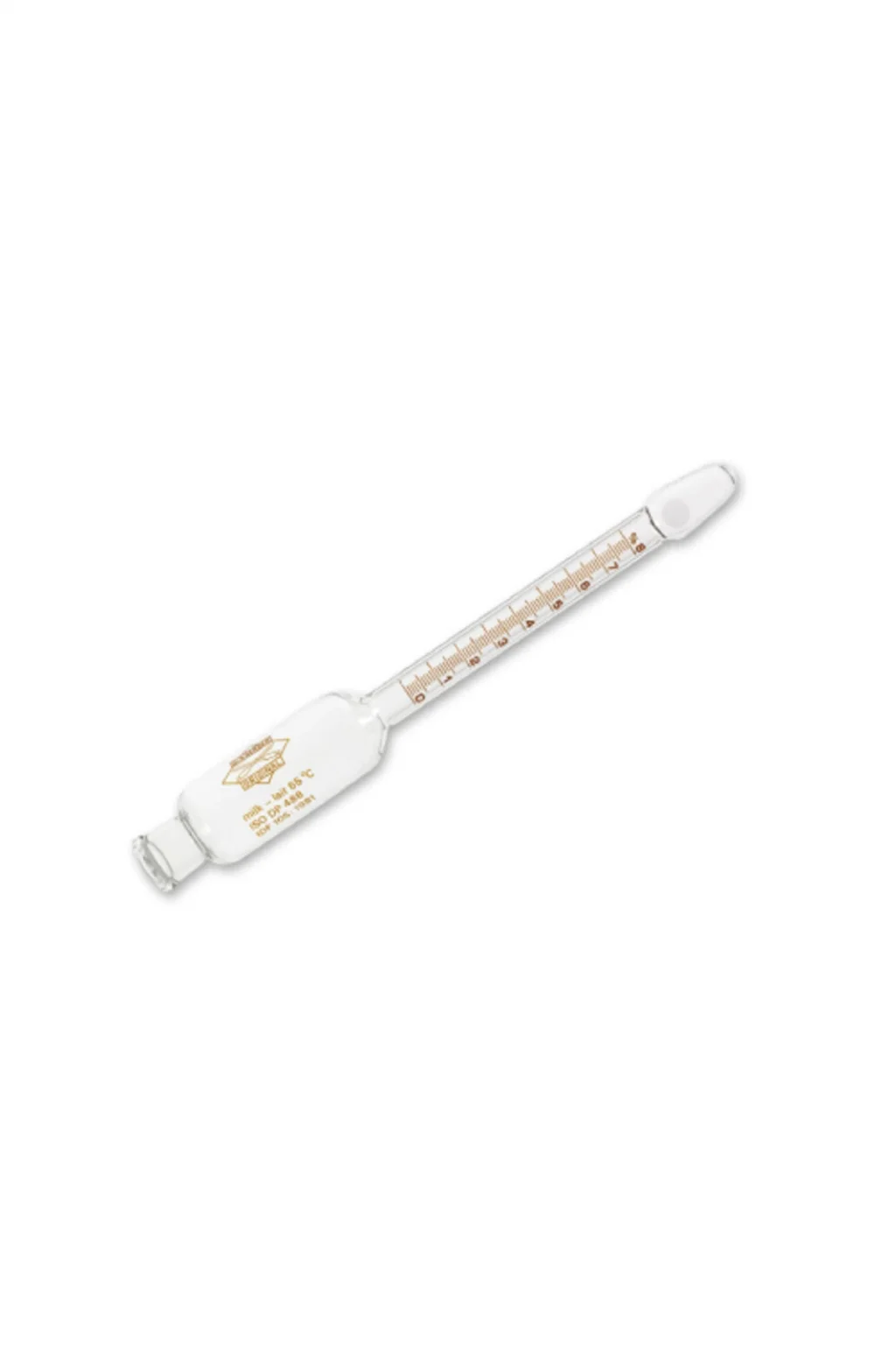 Ürün adı: Süt Bütirometresi Fiziksel yapısı: Cam (ısıya dayanıklı) Süt Bütirometresi ile Süt Yağı Miktarı Tayini: Prensip: Sütün yağ hariç diğer bileşenlerinin, asit ile parçalanarak, açığa çıkan yağın amilalkol yardımı ile berrak hale getirilerek, sütteki yağ miktarının % olarak okunmasıdır; Kimyasal Çözeltiler: Sülfürik asit, amil alkol; Araç ve Gereçler: Süt bütirometresi, 25 ml'lik süt pipeti, 10 ml'lik asit pipeti, amil alkol pipeti (1 ml), su banyosu; İşlem: Bütirometre içine 10 ml sülfürik asit konulur; Homojenize edilmiş sütten 11 ml alınır, bütirometre ağzının alt tarafından, yavaşça sülfürik asitle iki tabaka olacak şekilde ilave edilir; 1 ml amil alkol ilave edilir; Kauçuk tıpa ile ağzı kapatılır; Bütirometrenin alt ve üst uçlarından tutularak çalkalamaksızın, yarım dönme hareketleriyle pıhtılaşan kazein kayboluncaya kadar, alt üst edilir; Bu sırada ısı açığa çıktığı için, dikkat edilmelidir; Son çevirme işleminden sonra, içeriğin bütirometrenin geniş kısmında toplanması için, tıpa alta gelecek şekilde tutulur; Tıpa kısmı santrifüjün dış kısmına gelecek şekilde, simetrik olarak yerleştirilir; 5 dakika santrifüjlenir; Santrifüj ısıtıcılı değil ise, bütirometre 65°C'lik su banyosunda 5 dakika tutulduktan sonra, okuma yapılmalıdır; Bütirometre dereceleri kg üzerinden yapılmıştır; 1 litre süt 1032 g'dır; Buna göre kg'da 36 g yağ içeren bir sütün litresinde 1; 032 x 36 = 37 g/L yağ bulunur;