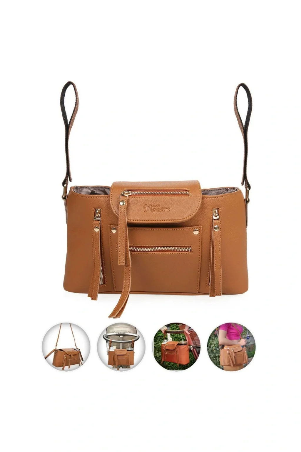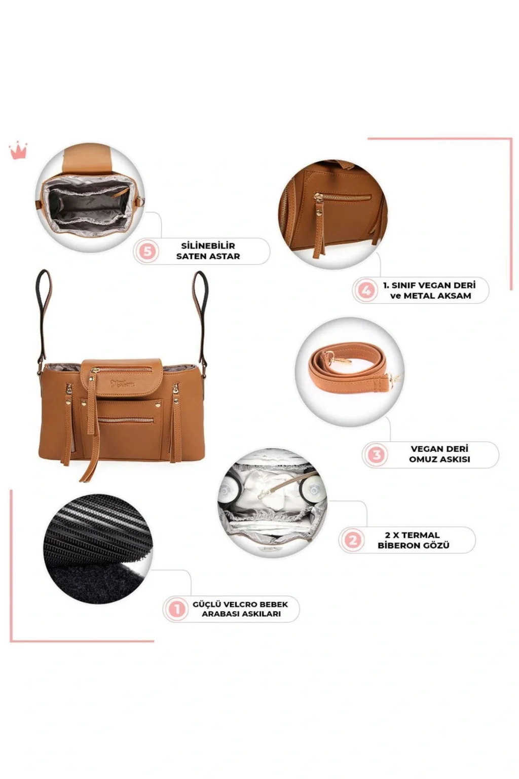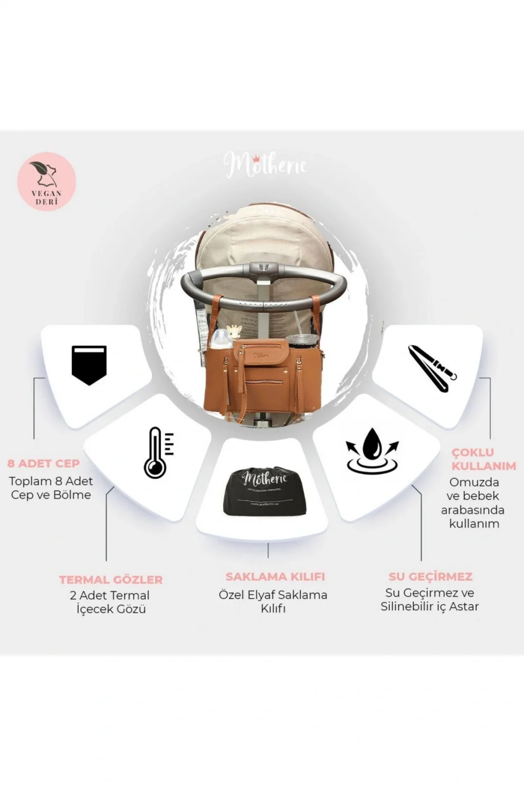 Motheric Bebek Arabası Organizer Çantası Motheric Deri Bebek Arabası Organizer Çantası, annelerin şık görünmeye ve kendilerini iyi hissetmeye devam ederken bebeğinin tüm ihtiyaçlarını rahatlıkla taşıması için tasarlanmıştır.; Ayrıca, bu çanta değerli bebek anılarınızı yıllarca saklamanızı sağlayacak şekilde tasarlanmıştır.; Keyifli bir gezintide yanınıza almak isteyebileceğiniz her şeyi rahatlıkla koyabileceğiniz bu özel tasarım Bebek Arabası Organizer Çantasını biberondan bebek bezine kadar tüm ihtiyaçlarınızı taşımak için kullanabilirsiniz.; Motheric Bebek Arabası Organizer Çantasının Eşsiz Özellikleri Yüksek Kaliteli Vegan Deri Malzeme ; Su Geçirmez Saten Astar.; ; 2 Adet Termal İçecek Cebi ; 1.Sınıf Metalik Fermuar ve Aksam ; Özel Tasarım ile Kolay Erişim ; Toplam 8 Adet Cep ve Bölme ; Su Geçirmez ve Silinebilir Kumaş ; Suya Dayanıklı ve Silinebilir İç Astar ; Termal İçecek Gözü ; Pratik Uygulanabilen Bebek Arabası Askı Aparatı ; Kolay Ulaşılabilen Anahtarlık Kayışı ; Vegan Deri Omuz Askısı ; Özel Saklama Kılıfı ; Ölçüler ve Özellikler Motheric Bebek Arabası Organizer Çantası ile biberon, bez, mama, oyuncak ve küçük yedek kıyafetlerin yanı sıra cep telefonu, anahtar gibi kişisel eşyalarınızı kısa gezintilerinizde kolayca taşıyabilirsiniz.; Ana Malzeme:Premium Vegan Deri Kapatma Tipi:Açık Kullanım Tipi:Bebek Arabası Organizeri İç Yapısı:Su Geçirmez Saten Astar Araba Askısı:Cırt Cırtlı Yapı Omuz Askısı:Metal Klipsli Vegan Deri En:14cm Boy:33cm Yükseklik:17,5cm Omuz Askısı Motheric Bebek Arabası Organizer Çantası ile birlikte gelen omuz askısı sayesinde çantanızı şık bir omuz çantası olarak da kullanabilirsiniz.