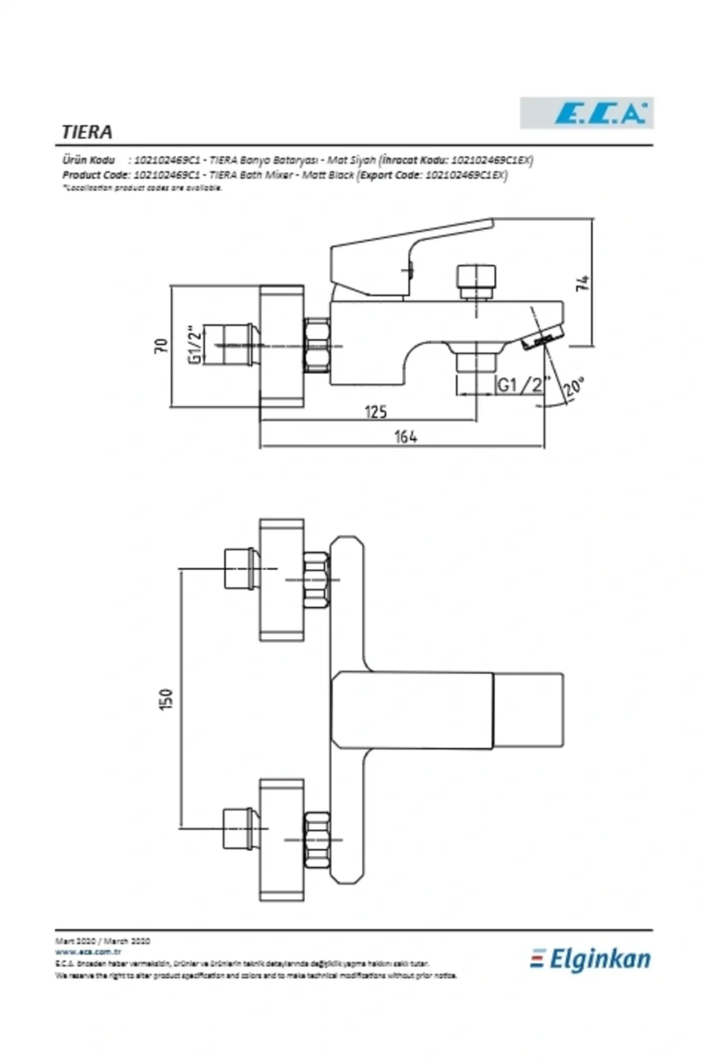 ECA Tiera banyo bataryası Mat Siyah rengindedir Çıkış ucu uzunluğu 16.4 cm Üst takım bağlantısı G 1/2 inç Kireç kırıcılı perlatör Kilitlemeli yön değiştirici