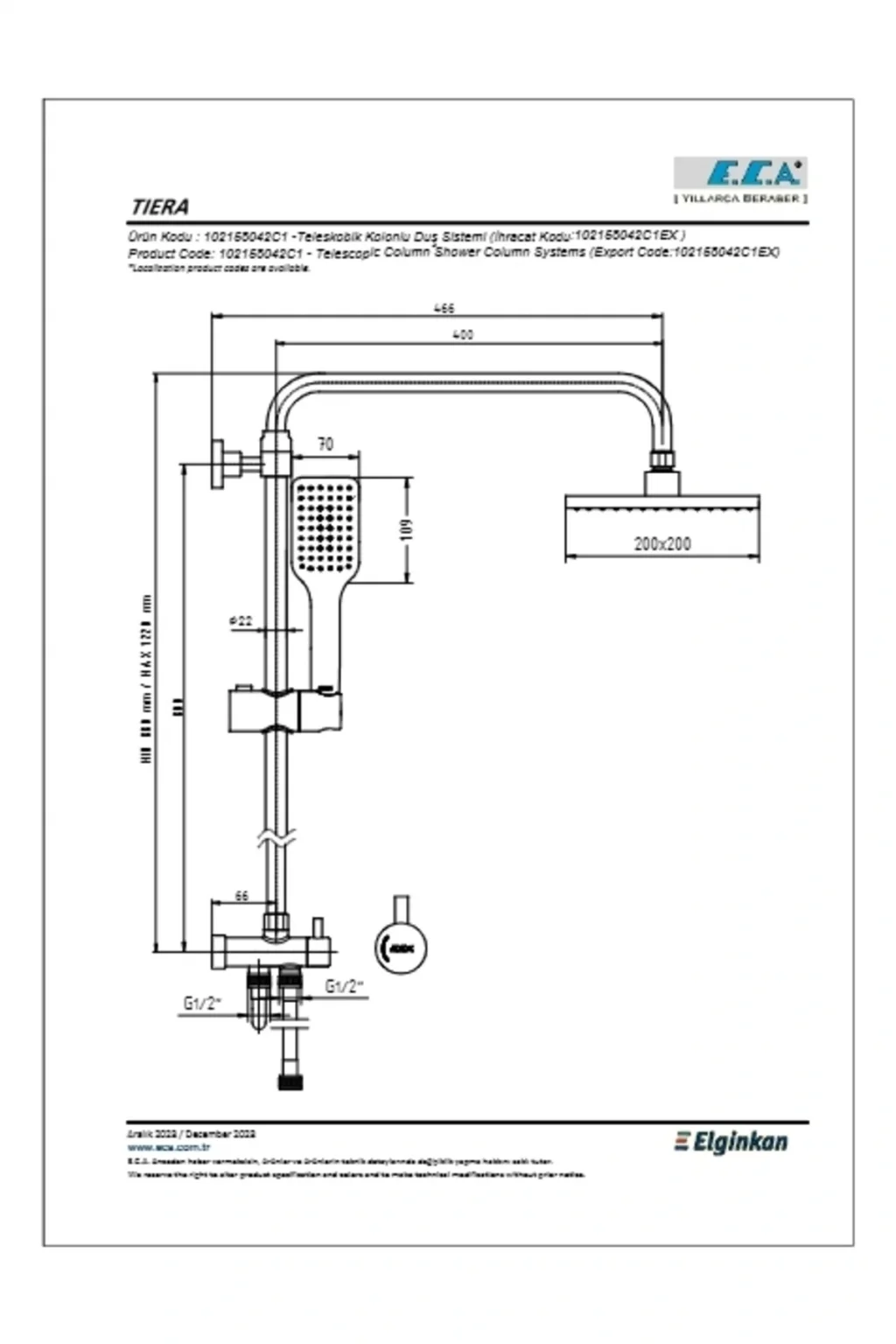 Eca Tiera Teleskobik Kolonlu Duş Sistemi Mat Siyah 200x200 200 mm x 200 mm mafsallı duş başlığı; Bir fonksiyonlu el duşu; Teleskobik özelliği sayesinde duş başlığının konum ayarı yapılabilmektedir; Ürün yüksekliği min 880 mm - max 1220 mm’dir; Duş başlığı akış ekseni 466 mm’dir; El duşu su akış miktarı 8,2 L/d dır; Duş başlığı su akış miktarı 8,2 L/d dır; 2 yollu özel mekanizmalı yön değiştirici; 150 cm burkulmaz el duşu spirali ; 80 cm karışım suyu giriş spirali;