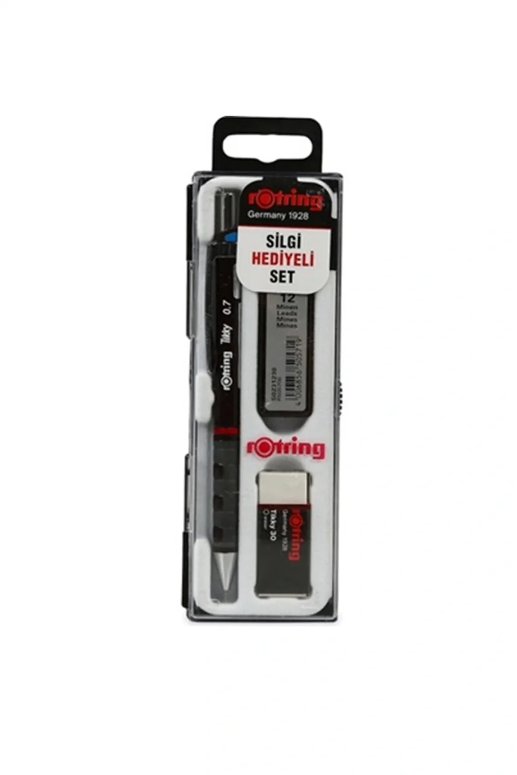 Rotring Tikky Okul Seti 0.7 mm Versatil Kalem + Silgi + Uç Bordo Birinci kalite malzemelerden üretilen Rotring Tikky okul setleri ile yeni okul döneminde temel ihtiyaçlarınızı tek seferde karşılayın! Klasik bordo tasarımdan sıkılan kullanıcılar için tikky şimdi Bir Birinden Güzel Renkler ile karşınızda. Her türlü yazı ve çizim işleriniz için özel olarak ve çok amaçlı bir şekilde tasarlanan rotring tikky uçlu kalemler, rotring tarafından üretilen ve tüm öğrenciler tarafından keyifle kullanılan orijinal ve klasik bir rotring ürünüdür. Yazım ve çizimleriniz sırasında sizi yormayacak şekilde tasarlanan rotring tikky uçlu kalemler yumuşak tutma alanı, dayanıklı plastik gövde ve uç kırılma sorununu en aza indiren sabit uç manşonu ile birlikte geliyor. Çok Amaçlı ve Ergonomik Kullanım Ergonomik hassasiyetler öngörülerek tasarlanan tikky kalemler üçgen formu sayesinde, akıcı ve rahat bir çizim yapabilmenize olanak sağlıyor. Sabit uç çıkışı, siz çalışırken görüşünüzü etkilemez ve çizim odaklı çalışanlar için hassas bir uç tutuşu sağlar. Set içerisinde yer alan polimer/grafit kalem izleri için özel olarak üretilen tikky 40 markalı silgi, olası hataları kirleri yakalayıp ve topak haline getirerek kâğıtta bir aşınma yapmadan ve çalışmalarınıza zarar vermeden siler ve ortam yüzeyini daima temiz kılar. Sayfa görüşünü engellemeyen ve hassas çizimlere imkân tanıyan kalem uç manşonu tasarım; Set kutusu aynı zamanda taşıma kalem kutusu olarak kullanılabilir; Kalem üzerinde dahili ve set ile birlikte gelen harici silgiler; Ergonomik ve dayanıklı kalem gövdesi; Tarzınızı yansıtan mavi tasarım; Set içerisinde 1 adet Rotring 0.7 mm versatil kalem, 1 adet 0.7 mm. 12’li rotring blister uç ve 1 adet Tikky 40 markalı silgi bulunmaktadır. Teknik Özellikleri 0.7 mm uçlu dahili silgili kalem; 0.7 mm 12'li Dayanıklı ve esnek blister uç; İz bırakmayan ve topaklanan tikky silgi; Plastik, kauçuk ve metal malzeme; Mekanik Kurşunkalem