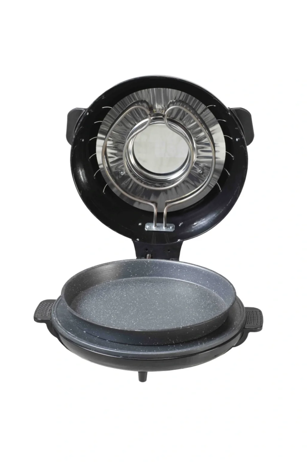Özellikler : - Güç : 2000 Watt- Çok amaçlı pişirici.; - Ekmek pizza lahmacun ve daha bir çok yemek pişirme özelliği.; - 40 cm.; çap geniş iç hacim,- Yapışmaz granit kaplama, - Enerji tasarrufu ve kolay temizlenebilir.; - 300'C termostat,- Ayarlanabilir sıcaklık,- Kolay taşınabilir tutma kulplar.