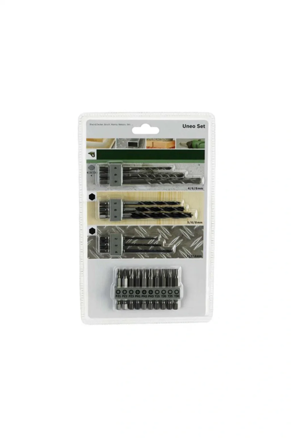 3 Sds-Quick beton uneo ucu 4/6/8 3 altıgen şaftlı ahşap matkap ucu 5/6/8 3 altıgen şaftlı metal matkap ucu 2/3/4 10 vidalama ucu, U = 50 mm, PH 1/1/2/2/3/3, PZ 1/1/2/2/3/3, SL 4/4/6/6/7/7, T 20/20/25/25/30/30