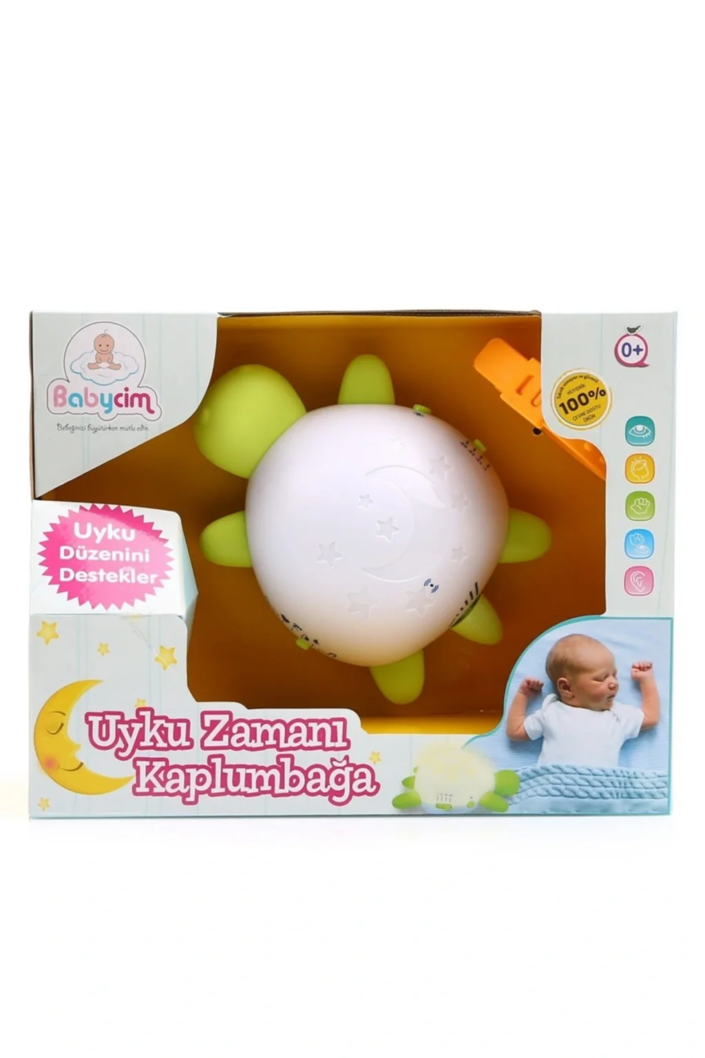 Özellikleri:Babycim Uyku Zamanı Kaplumbağa, minikler için en güzel hediye!Uyku Zamanı Kaplumbağa, farklı ses seçenekler ile bebeğinizin uykuya geçişini kolaylaştıracak uyku düzeni kazanmasına destek olur.Pşşş Sesi: Bebeğin anne karnında duyduğu kan akışı ve nefes alma sesi ile aynıdır ve bebeği anne rahminde hissettirir.Anne Kalp Sesi: Bebeğin anne rahminde duyduğu annesininKalp atış sesidir. ; Kendini anne karnında hissederek güven duygusu ile uykuya geçişini kolaylaştır. ; Sac? Kurutma Makinası Sesi: Beyaz gürültülü olarak da bilinen bu ses anne karnındaki sese benzerdir ve bebeği anne rahminde hissettirir. ; Elektrik Süpürgesi Sesi: Beyaz gürültü olarak bilinen bu ses anne karnındaki sese yakın olduğundan bebeğinizin uykuya geçişine destek olur. ; Doğa Sesi: Bebeğin sakinleşmesini ve uyku geçişine yardımcı olur. ; Klasik Müzik: Bebeğin sakinleşmesine ve uykuya geçişine destek olur.Beşiğe, pusete bağlanabilir.Zaman Ayarı: 4 kademeden oluşur.Işık Ayarı: Farklı renkler içerir. ; Işık geçişleri olduğu için göz mesafesi ayarlanmalıdır.Ses Ayarı: 5 kademeden oluşur. ; Ses düzeylerine göre, bebeğinize yakınlık durumuna dikkat ediniz.%100 HijyenikYaş Aralığı: 0 ay ve üzeriKısa Bilgi:Uyku üzerine yapılan birçok bilimsel çalışma bebeklerin sağlıklı gelişimde uykunun önemi vurgulamaktadır. ; Bebeklerin düzenli bir uyku rutininin olması tüm gelişim alanları için çok önemlidir. ; Bebeklerin düzenli uyumalarını ve uykuya geçişini kolaylaştıracak önerilerin başında onlara huzurlu ve sakin bir fiziksel ortamın sunulması gelmektedir. ; Özellikle uykuya geçmekte zorlanan bebeklerde anne rahmindeki ortamı hissettirecek sakinleştirici sesler uykuyu geçişi kolaylaştırmaktadır. ; Uyku zamanı kaplumbağanın sakinleştirici sesleri ile bebeğiniz huzurlu ve mutlu uyusun.Video Platform;