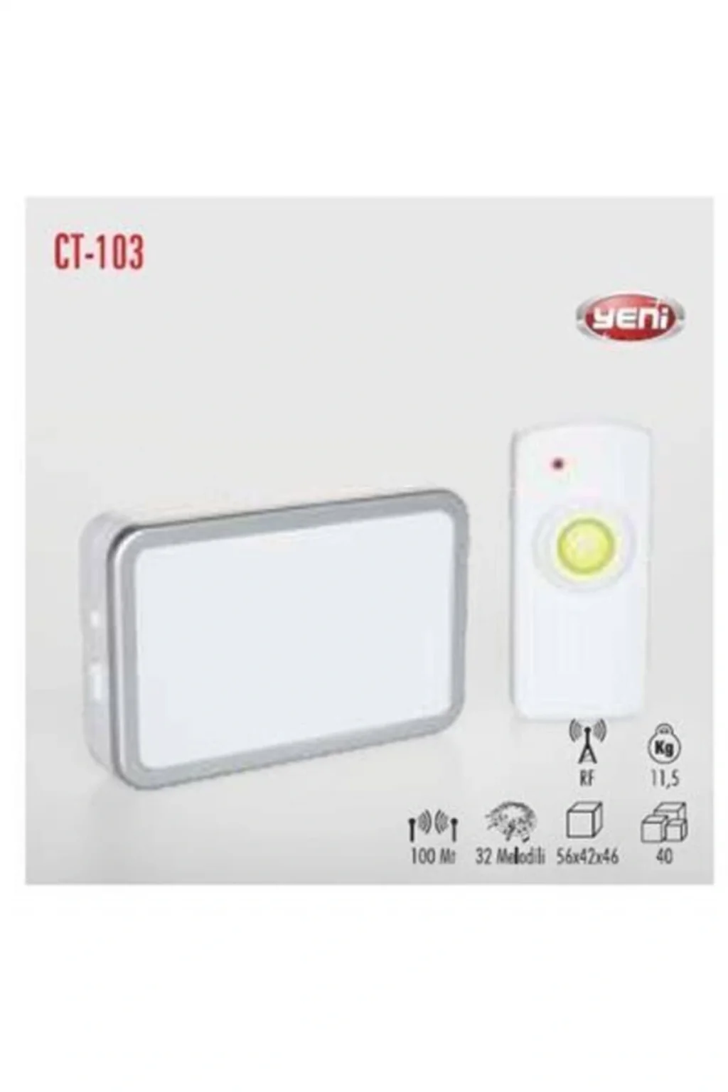 CATA Uzaktan Kumandalı Zil CT-103 Ürün Özelliği : 35 Melodili Kapalı alan : 50 m Bağlantı Şekli : Kablosuz Açık alan : 100 m Detaylı Bilgiler KABLOSUZ KAPI ZİLİ Kablosuz kapı zilinin kurulumu çok kolaydır ve iç dekorasyonunuzda kablo kirliliğini ortadan kaldırmaktadır. ; Kumandasının uzak mesafelerde bile etkili bir şekilde çalışması ( 100m ) sayesinde bir çok farklı mekanlarda kullanabilirsiniz. ; CATA uzaktan kumadalı kapı zilleri farklı frekanslara sahip olduğu için aynı mekanda bir den fazla CATA uzaktan kumadalı kapı zilli kullanabilirsiniz. ; 32 farklı melodiye sahiptir. ; ( Up Music Down butonu ile ayarlayabilirsiniz ) Ses tonu seviyesini “Volume” butonu ile ayarlayabilirsiniz. ; Alkaline pil 1 yıl dayanabilir. ; (20 defa / gün ) Algılama mesafesi açık alanlarda 100 metre kapalı alanlarda 30-50 metre aralığındadır. ; Yüksek müzikal sesi ile iç mekânlarda algılaması mesafesi hesaplanarak istenilen yere yerleştirilebilir. ; Çevre dostu ve Enerji tüketimi azdır. ; KULLANMA TALİMATI Basma düğmesini kapıya vida, yapıştırıcı veya çift taraflı bant ile sabitleyiniz. ; Yağmura maruz bırakılmadığından ve metal objelerin yakınına konmadığından emin olunuz. ; Pil haznesinin kapağını açınız ve 2 adet AA boyutundaki alkaline pili yerleştiriniz. ; Ürün pili garanti kapsamında değildir. ; Pilin akmasından kaynaklı sorunlar garanti kapsamında değildir. ; Kapı zili, iç mekanlarda algılama mesafesi hesaplanarak istenilen yere yerleştirilebilir ve yeri istenilen şekilde değiştirilebilir. ; Belli bir zaman sonra düzenli çalışmayan zilin pillerinin değiştirilmesi gerekmektedir (urünlerimiz ile ilgili sorularinizi lutfen firmamiza iletiniz;