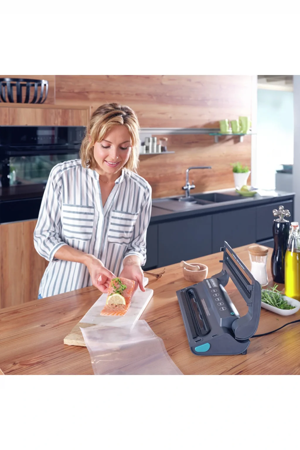 XXL Vakum Pompası Çok güçlü pompayla hızlı vakumlama (dakikada 12 litre) Sensör Dokunmatik Ekran Sesli geri bildirime sahip ekranın kullanımı özellikle kolaydır.; Hijyenik Vakum odası kolayca çıkarılabilir ve temizlenebilir.; Darbe Fonksiyonu Vakumun bireysel gücü, özellikle hassas yiyeceklerin vakumla kapatılması için kontrol edilebilir.; Doğal Depolama Hemen hemen her tür gıda, koruyucu maddeye gerek kalmadan saklanabilir.; Çok Yölnü Vacu Powe 500, genişliği 30 cm'ye kadar olan tüm markalı rulo ve torbalar için uygundur.; Leifheit Çantaları Dahil 10 adet ücretsiz Leifheit çantası (20x30 cm) dahildir.; Yiyeceklerini beş kat daha uzun süre taze tutmak isteyen herkes için Leifheit Vacu Power 500 vakum cihazı kullanılacak cihazdır.; Bu, dakikada on iki litre performansa sahip, özellikle verimli bir pompaya sahiptir.; Meyve, sebze, et vb.; anında vakumlanarak kapatılabilir.; Sonik sensörlü dokunmatik ekran sezgiseldir ve kullanımı kolaydır.; Durdurma düğmesine basılarak vakumlama işlemi istenildiği zaman durdurulabilir.; Bireysel emiş gücü, darbe fonksiyonu kullanılarak da ayarlanabilir.; Elektronik sıcaklık kontrolü güvenli kullanım sağlar ve vakumlu poşetlerin dikişlerinin erimesini önler.; Çıkarılabilir vakum odası da oldukça pratiktir.; Hijyenik olarak hızlı bir şekilde temizlenmesi kolaydır.; Vakumlu saklama kapları entegre fonksiyon kullanılarak vakumlanabilir.; Bağlantı vakum tüplü Vakum kapları Leifheit'tan ayrı olarak temin edilebilir.; Vacu Power 500 vakum cihazı, ekstra güvenli sızdırmazlık sağlamak için çift dikiş yapar.; Yiyecekleri taze ve hava geçirmez tutmak için vakumlu poşetlerin ve ruloların kalitesi son derece önemlidir.; On adet 20 x 30 cm Leifheit vakum torbası dahildir.; Bunlar ekstra güçlüdür ve yapısıyla en iyi sonucu verir.