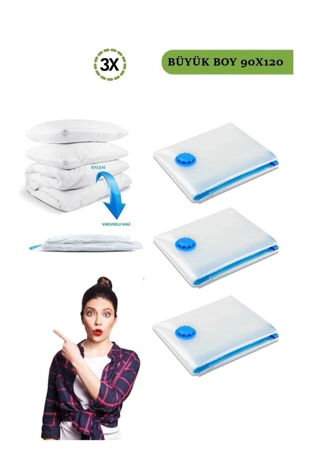 - Dayanıklı plastik materyalden üretilmiş olup, uzun ömürlü kullanım sunar; - 90x120 cm boyutlarındaki büyük boy tasarımı ile geniş saklama alanı sağlar, bavul düzeninizi kolayca organize etmenize olanak tanır; - Üç adet vakumlu hurç seti, birden fazla eşyanızı düzenli bir şekilde saklamanız için idealdir; - Vakumlu yapısı sayesinde eşyalarınızın tozdan korunmasına yardımcı olur ve düzenli bir görünüm kazandırır;