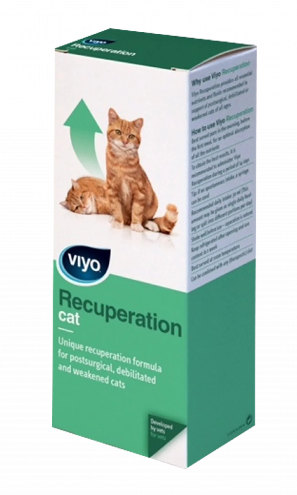 Viyo Recuperation, kediler için vitamin ve mineral içeren besin takviyesi. Yüksek lezzete sahip olan sıvı gıda takviyesi, iştahı arttırarak yeme ve içmeye teşvik etmektedir. Yeni bir tedavi süreci, hastalık, ameliyat öncesi veya sonrası iyileşme süresinde yardımcıdır. Bağırsak sağlığını iyileştirerek emilim kapasitesinin artmasını sağlamaktadır. % 100 doğal içeriğe sahiptir. Kedilerin vitamin ve mineral ihtiyaçlarına uygun olarak formüle edilmiştir. Ameliyat öncesi ve sonrası evcil hayvanların bakımını sağlar, tedavi edici diyete geçişi kolaylaştırır, sıvı alımına teşvik eder, yavru kedilerde gelişimi destekler, içerdiği prebiyotiklerle bağırsak florasını onarır, deri ve tüy yapısını canlandırır, ağız yolu ile ilaç alımını kolaylaştırır, iştahın artmasına yardımcı olur, güçten düşmüş, hasta veya yaşlı kediler için iyi bir sağlık desteğidir. Kediler için günlük doz ortamala 30 ml’dir.