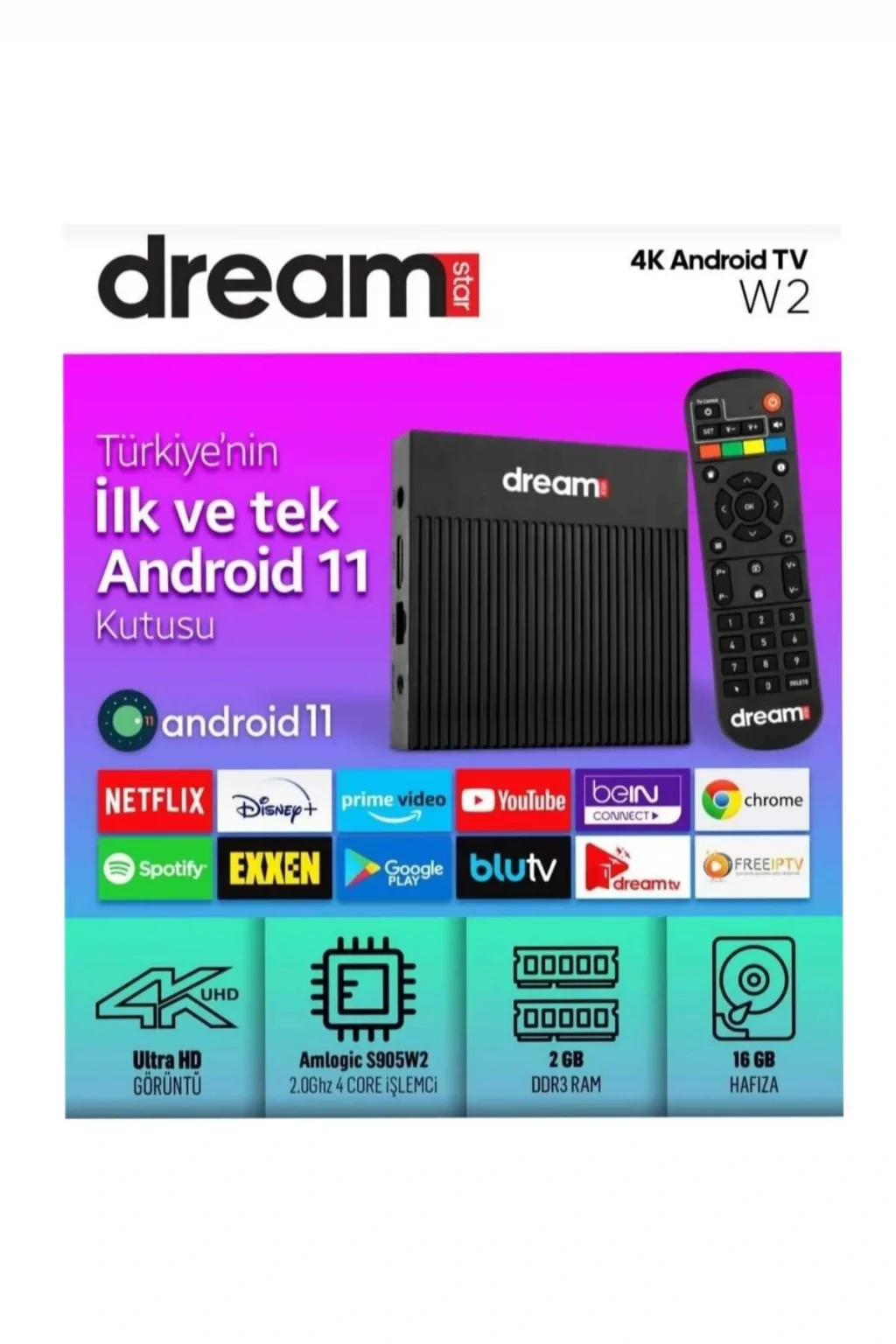 İŞLETİM SİSTEMİ ANDROID 11 İŞLEMCİ AMLOGIC S905W2 2; 0GHZ QUAD CORE eMMC FLASH HAFIZA 16 GB RAM 2 GB DDR3 RAM KRİPTO MOTORU AES/TDES/SHA; 1/HMAC/SM4 USB / PCI; E 1X USB2; 0 + USB3; 0 CAS WMX,WİDEVİNE CAS,IRDETO MSR 3; 2 HAFIZA TÜRÜ EMMC 5; 0,NAND FLASH ,SPI NOR / NAND, SD VİDEO GİRİŞ/ÇIKIŞ 4K60 HDMI 2; 1,HDCP 2; 2 ,CVBS ETHERNET 10/100/1000 mac + 10/100 PHY SD KART OKUYUCU VAR DAHİLİ BLUETOOTH BLUETOOTH 5; 0 KABLOSUZ WiFi DAHİLİ 2; 4/5 GHz SES İŞLEME DOLBY,DTS,VAD,ASRC/EQ/DRC HDR/WCG HDR10/10+,HLG,DOLBY VİSİON,TCH PRİME KUMANDADA SESLİ KOMUT YOK NETFLİX VAR FREE İPTV VAR AMAZON PRİME VAR MYDREAMTV VAR CHROME VAR YOUTUBE VAR;