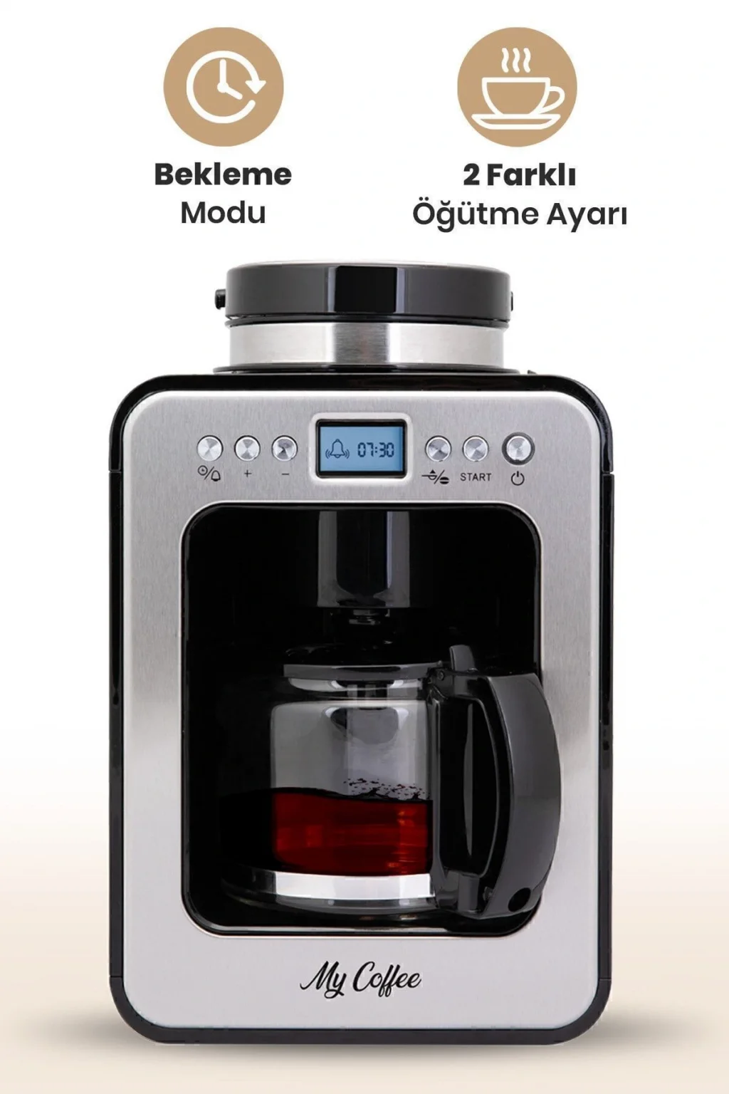 Goldmaster My Coffee Wake Up Öğütücülü Filtre Kahve Makinesi 2 in 1; çekirdek ve toz kahve ile kahve yapabilme özelliği.; Bekleme ara yüzü.; İri ve ince taneli öğütme seçeneği ile iki farklı öğütme ayarı.; 24 saat programlayabilme özelliği.; Hem çekirdek hem de toz kahve modu için zaman ayarlı çalıştırabilme fonksiyonu.; Çıkarılabilir ve kolay temizlenebilir filtre ve öğütücü haznesi.; Kahvenin hazırlandığını bildiren sesli uyarı sistemi.; Kahve hazırlandıktan sonra yarım saat sıcak tutma fonksiyonu.