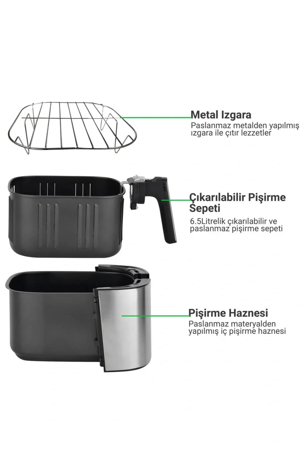 - Hava teknolojisi sayesinde yağsız ve sağlıklı pişirme deneyimi sunar, lezzetli sonuçlar elde etmenizi sağlar; - Sıcaklık kontrolü özelliği ile yemeklerinizi istediğiniz kıvamda pişirebilir, mükemmel sonuçlar elde edebilirsiniz; - Dayanıklı metal materyali sayesinde uzun ömürlü kullanım vaat eder ve mutfakta şıklığı korur; - Zamanlayıcı fonksiyonu ile pişirme süresini kolayca ayarlayabilir, zamanınızı daha verimli kullanabilirsiniz;