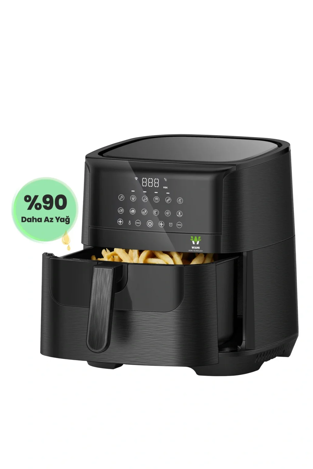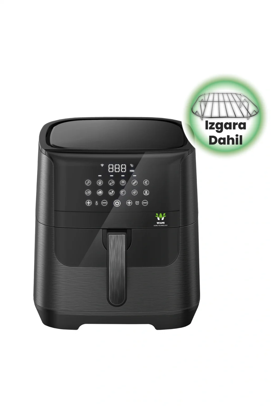 Sıcak hava yöntemi ile pişirme işlemi gerçekleştiren airfryer 1700 W güçte çalışır.; 6.5 lt hazne kapasitesi olan yağsız fritöz 1 hazneye sahiptir.; Yeni nesil sıcak hava fritözü çıkarılabilir haznesi ve ısı ayarı ile kolaylık sunar.; Airfryer tavuk ve çeşitli kızartma yemeklerini yapabileceğiniz zamanlayıcı ayarına sahiptir.; Az yağda kızartma ve pişirme fonksiyonu sayesinde airfryer köfte ve kırmızı et pişirmek için uygundur.; Wiami airfryer yağsız kızartma ve yağsız pişirme seçenekleri sunar.; Bulaşık makinesinde yıkanabilir aksesuarları ile sıcak hava fritözü kolay temizlik sağlar.; Dokunmatik kontrol paneli bulunan airfryer balık ve su ürünlerini pişirmek için de uygundur.; Pratik kullanım sunan akıllı fritöz kaymaz ayaklara sahiptir.; Airfryer ızgara yemekleri pişirmek için kızartma sepeti aksesuarı vardır.; Paslanmaz çelik malzemeden oluşan Wiami fritöz siyah ve gümüş renktedir.; Wiami airfryer 7 lt 33.8x36.8x28.8 cm boyutunda ve 5.2 kilogram ağırlığındadır.; LED ekrana sahip olan airfryer 7 lt dokunmatik ekran üzerinden pişirme programı ayarları sunar.; 8 farklı pişirme programıyla siyah fritöz ile dilediğiniz ısı ayarında yemek hazırlayabilirsiniz.; Kolay servis için çıkarılabilir hazneli fritöz aynı zamanda yemek hazır olduğuna dair bir ikaz sinyali verir.;