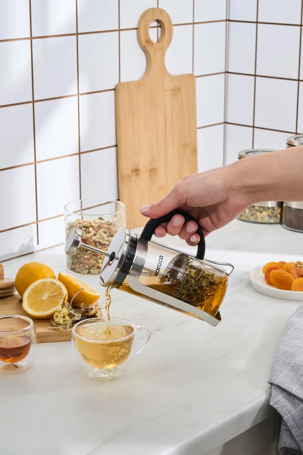 Cookplus x Karaca Coffee Bean Kaşık Hediyeli Borosilikat Cam French Press Metalik 350 Ml;Malzeme: Cam;Hacim: 350 ml;Kahve keyfine hızlıca ulaşın;Kahve içmek istediğinizde aradığınız lezzete ulaşmanın en hızlı yolu french press’tir.; Pratik ve doğru demleme yöntemiyle kahvenizin kalitesini ve aromasını korur.; Filtresi sayesinde ise pürüzsüz bir kahve keyfi sunar.;Bitki çayını ideal şekilde demleyin;Bitki çayı demleyeceğinizde de french press kullanabilirsiniz.; Demleme çubuğu, çay yapraklarının aromasını en iyi şekilde almanızı sağlar.; French press ile çayınızı uzun süre taze ve sıcak tutabilirsiniz.;Zarif ve dayanıklı tasarım;Borosilikat cam malzemesi sayesinde hem zarif hem dayanıklıdır.; Yüksek ısıdan ya da ısı değişimlerinden etkilenmez ve uzun ömürlüdür.;Kırılmalara karşı koruma kabı;Cam karafı çevreleyen koruma kabı, kırılmaları önler ve zeminlerle ısı temasını engeller.; Koruma kabı ile karaf birbirinden ayrılarak temizliğe hazır hale gelir.;Sökülebilir parçaları kolayca temizleyin;French press’inizin sökülebilir parçaları birbirinden ayrılarak zahmetsizce temizlenebilir.; Temizlik sonrasında parçaların birleşimini de kolayca yapabilirsiniz.