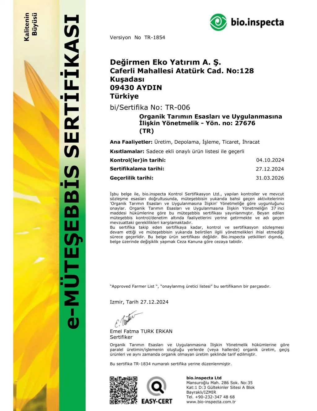 - Organik sertifikalı üretim